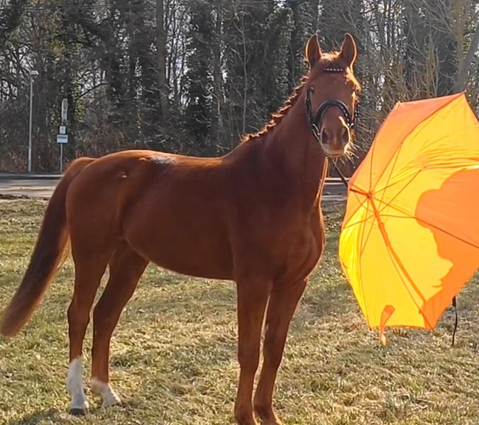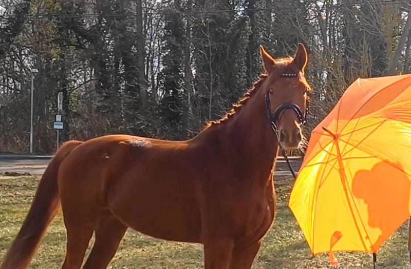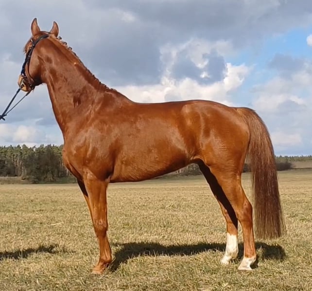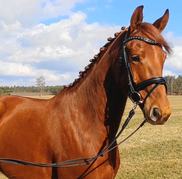 Unser Excalibur SB kommt im praktischen XS-Format daher, aber hat ein großes Herz an der richtigen Stelle! Freundlich, mutig und seinen Menschen stets treu - so ist der kleine Mann. Excalibur wurde 2023 spät angeritten und befand sich über den Jahreswechsel 2025/2026 zur weiteren Ausbildung im Brandenburgischen Haupt- und Landgestüt in Neustadt/Dosse. Da er auf einem Bauernhof geboren wurde und aufgewachsen ist, sind Maschinen wie Traktoren, Hoflader, Mini-Bagger bis hin zu Laubbläsern absoluter Alltag für ihn. Er ist dabei aufgeschlossen und beobachtet das Geschehen mit totaler Gelassenheit. Der alltägliche Umgang mit Menschen ist für Excalibur eine Freude. Er ist immer freundlich, unkompliziert und lässt sich gern ein Leckerchen reichen. Seine Koppel lag direkt neben einer Hundeschule, sodass dies für ihn absolute Routine ist. Auch Hühner aus dem benachbarten Garten sind kein Problem. Unser Excalibur mag die Gesellschaft von anderen Pferden und ist diese sein Leben lang gewohnt. So war er Weidebegleiter für verschiedene Wallache, u.a. auch einem Rentner, und hatte im Stall auch seine Pferdebox zwischen den Boxen von jungen Hengsten und Jährlingsstuten. Trotz seiner kompakten Größe lässt er sich nicht die Butter vom Brot nehmen, zeigt aber dennoch immer eine soziale Größe in dem er Schwächere beschützt. Sein Vater ist der Trakehner PrH Editorial. Editorial war der Reservesieger der Trakehnerkörung 2007. Die Nachkommen dieses Hengstes zeichnen sich durch viel Typ, überdurchschnittliche Grundgangarten und ein sehr gutes Interieur aus. Halbbruder von Editorial ist Imperio, der unter Hubertus Schmidt hoch erfolgreich war. Excalibur stammt aus einer Mutterlinie, die auf unsere Maika zurück führt. Die Pferde aus dieser Linie zeichnen sich sowohl im Sport- als auch im Freizeitbereich durch einen sehr guten Charakter und ihre vielseitige Einsatzbandbreite aus. So sind z.B. Lord Capri SB (S-platziert in der Dressur) oder Sabrina SB (Sportname Sabrina-Vera, siegreich in der Dressur M**) hervorzuheben. Sowie ein Santano SB, der sowohl vor der Kutsche aber auch als Voltigierpferd punkten konnte. Seine jüngere, größere Schwester ist die Staatsprämienstute Belissima SB. Aufgrund seines hohen Blutanteils der Trakehner, aber auch Vollblut (Montano - Modus xx) verfügt Excalibur über einen eleganten, leichten Typ mit bester Kondition für Strecken. Matsch und co. sind kein Problem und stören ihn nicht.