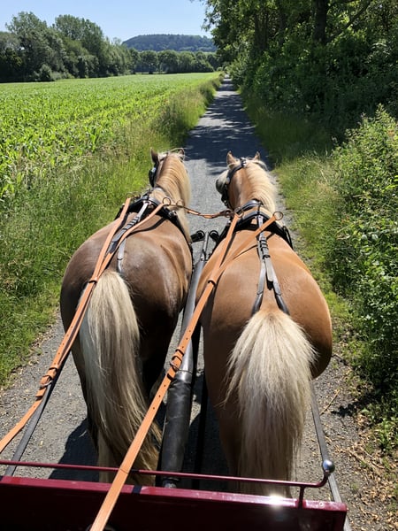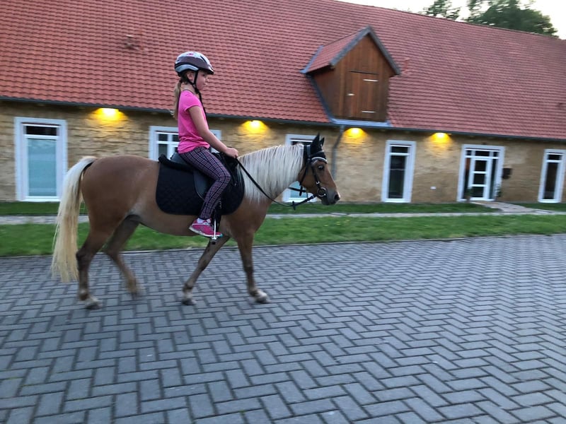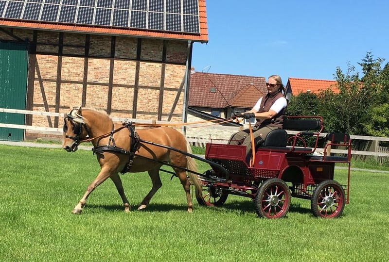 Nous proposons notre jument Classic-Pony Roxy ainsi que quelques poulains de cette année (2 juments et 2 étalons, voir les quatre photos des poulains du jour de l'enregistrement). Les poneys vivent chez nous dans un beau box ouvert lumineux, ils sont habitués aux enfants et aux chiens et s'entendent tous très bien en groupe. Notre troupeau est complété par deux juments hanovriennes et une jument Welsh. Les poneys s'entendent également très bien avec les grands chevaux. Roxy est une excellente jument de trait, elle est inébranlable devant la voiture et résiste aux coups de feu, bien sûr, elle est aussi sûre dans la circulation, et elle est facile à manipuler. Elle peut être attelée en simple ou en paire. Roxy peut également être montée par des enfants, bien que nous la considérions plutôt comme un poney de trait pour adultes. Roxy a un rang élevé et est dominante dans le troupeau (même vis-à-vis des grands chevaux). En raison de sa lignée, elle est également adaptée comme jument de reproduction, elle a eu jusqu'à présent cinq poulains qu'elle a élevés de manière très maternelle. Tous nos poneys et chevaux sont régulièrement vaccinés, vermifugés, et sont vus par le maréchal-ferrant et le dentiste équin. Si vous êtes intéressé, n'hésitez pas à consulter notre site internet classic-pony-borrmann.de et/ou à nous contacter au 0170 / 11 25 230. Nous mettons beaucoup d'efforts dans nos animaux, investissons beaucoup de passion et de cœur, et nous serions très heureux s'ils trouvaient un joli nouveau foyer !