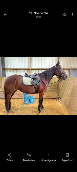 Unsere Liebe Stute sucht ein neues liebevolles Zuhause. Sie ist 2013 geboren und hat ein Stockmaß von 1,60 m. Sie ist im täglichen Umgang brav und möchte immer gefallen. Sie war früher auf der Trapprennbahn und seit ca. 5 Jahren in meinem Besitz. Sie lässt sich von mir in allen drei Grundgangarten reiten. Dabei ist sie sehr fein und sensibel. Der Galopp in der Halle fällt ihr noch was schwer im Gelände klappt es gut (ist allerdings sehr flott dabei). Sie ist regelmäßig geimpft und entwurmt und alle sechs Wochen kommt der Hufschmied und leg ihr einen Vollbeschlag an. Sie ist verlade und Schmiedefromm Kein Anfänger fährt, da sie in neuen Situationen auch mal ängstlich reagieren kann. In gewohnter Umgebung ist sie stets brav. Sie benötigt eine einfühlsame, ruhige, liebevolle und erfahrene Hand. Bei Interesse oder für weitere Informationen stehe ich Ihnen gerne zur Verfügung.