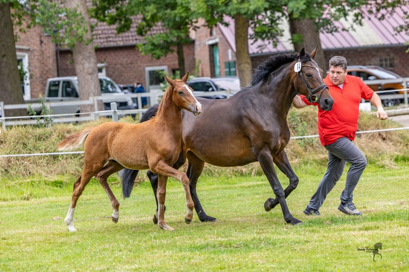 For sale is a promising German Riding Pony stallion, born in 2025. With his attractive chestnut coat and an estimated final height of 150 cm, he is not only a real eye-catcher but also a talented partner for dressage. This stallion impresses with his quality of movement and pleasant temperament. He is well-mannered and already shows promising approaches in his training. He is well-socialized and familiar with other horses. The last pictures show the father, Neuseriem Deichkieker WE. If you are interested or have any further questions, please feel free to contact me. We look forward to your message!