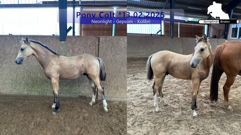 Wir bieten ein springbetontes Ponyhengstfohlen in besonderer Farbe, der bereits zeigt wofür er geboren ist. Ein aufgewachter und springbegeisterter Kerl, der jetzt schon weiß wie es geht. Vater Neonlight war im letzten Jahr bei den Springponys zum Bundeschampionat qualifiziert. Die Mutter ist eine zu klein gebliebene Warmblutstute, die selbst in Springen bis zur Klasse M erfolgreich war und ebenfalls Tochter einer S/1,40m-siegreichen Stute, Vollschwester einer S/1,40m-erfolgreichen Stute und Halbschwester mehrerer S***/1,50m erfolgreichen Springpferde war. Muttervater Gepsom war lange Zeit unsere sportliche NR 1 im Stall und war bis S****/1,55m Level erfolgreich.