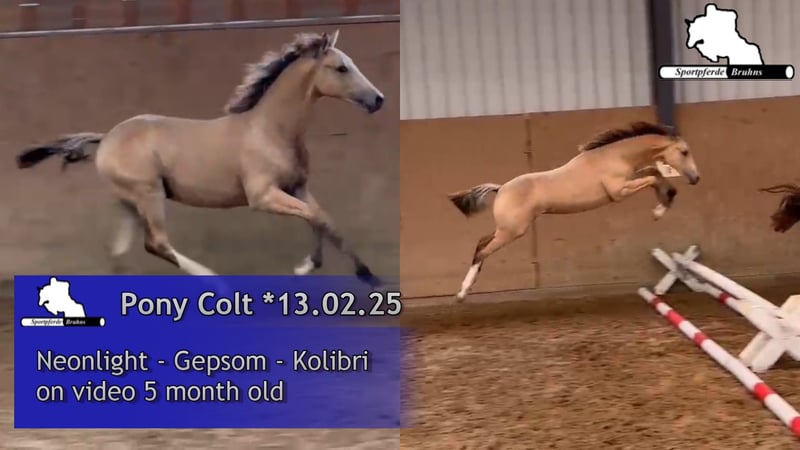 Offriamo un puledro stallone pony con una particolare colorazione, che già dimostra per cosa è nato. Un ragazzo sveglio e appassionato di salto, che sa già come si fa. Il padre Neonlight si è qualificato lo scorso anno per il Bundeschampionat tra i pony da salto. La madre è una cavalla di sangue caldo rimasta di piccole dimensioni, che ha avuto successo in salti fino alla classe M e che è anche figlia di una cavalla vincitrice in S/1,40m, sorella piena di una cavalla di successo in S/1,40m e sorellastra di diversi cavalli da salto di successo in S***/1,50m. Il nonno materno Gepsom è stato a lungo il nostro numero 1 sportivo in scuderia ed è stato di successo fino al livello S****/1,55m.