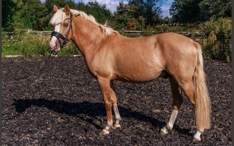 For sale is an enchanting German Riding Pony stallion born in 2022. This elegant Palomino impresses with its striking color, complemented by blue eyes, and its charming demeanor. He is truly a gentleman through and through. The stallion shows great potential in dressage and is already well-trained. He will continue to develop significantly as he is just beginning to explore his potential. He has already achieved high placings in a riding horse test against larger horses. With his friendly character and eagerness to learn, he is suitable for both experienced riders and beginners who enjoy training a young horse. Every rider who has ridden him so far has been able to smile—he simply makes riding enormous fun! He is well-socialized, familiar with handling alongside other horses, and behaves calmly. His balanced temperament makes him an ideal partner for training and leisure. If needed, he can be lunged and can remain with us for the upcoming period. Information about the sire: The handsome and gaited sire, Gründleinshofs Golden Starlight, is always performance-ready. He is extremely rideable, FEI-level competent, and equipped with a wonderful temperament. His rideability and willingness to perform have been consistently inherited, combined with three splendid, energetic gaits. In 2018, his son was the Zuchtverbandschampion of the 4-year-old stallions, and another was licensed. Further offspring are expected in the coming years. Videos and photos of his progeny can be sent via WhatsApp. Golden Starlight was a Kaderpony and has numerous wins and successes in classes L* and L**. His pedigree features the crème de la crème of riding pony breeding—Bundeschampions, winners of performance tests, highly decorated state premium mares... He is sired by the winning stallion of the 1999 Rheinische Körung, FS Golden Highlight, by FS Golden Moonlight – Power Boy – Valentino. Golden Highlight was the Bundeschampion of 3-year-old stallions in 2000 and, a year later, Bundeschampion of 4-year-old stallions in Warendorf. He was also an HLP winner and multiple show winner. He sired several licensed stallions, including Brantops Go for Gold, Go for Gold (notably, the Spitzen-Auktionsfohlen in Münster Handorf under the name Haiducci, sold for €7,200), The Black Highlight, Giuseppe, Gandalf, among others. The dam of Golden Highlight, Petty Smooth by Power Boy – Valentino – Kheman, also produced the 1st Reserve Champion of the Verden Pony Licensing in 2005, Charmant by FS Champion de Luxe. From Golden Highlight’s dam line come licensed stallions such as Domecq by Derbino and Cassini by Cocky Dundee, Disney Star by Derbino, as well as the M-level dressage mare Power and Kess by Power Boy and the highly promising mare Primadonna by Power Star B. Golden Highlight’s sire, FS Golden Moonlight, was also a champion stallion at his licensing, Vice-Bundeschampion in 1996, and Bundeschampion of 5-year-old dressage ponies in 1997. He is full brother to FS Don't Worry—his dam, St.Pr.St. FS Golden Sunlight, was Vice-Bundeschampioness in 1995, multiple Bundessiegerin, and dam of several licensed stallions including FS Chambertin by FS Champion de Luxe. From Golden Moonlight’s dam line come licensed stallions such as FS Pour l'Amour, FS Challenger, and FS Cracker Jack. Golden Moonlight’s sire, Golden Dancer, and grandsire, Dancer B, were multiple S-level dressage winners and placers against larger horses, achieving success at various championships. They have also earned a notable reputation in breeding. His dam, State Premium mare Cindy Lou, is a gem both in breeding and sport. Through her sire, FS Cocky Dundee, she is half-sister to FS Champion de Luxe, the licensed stallion, multiple Bundeschampion, HLP winner, and three-time Bundessieger. Her dam, State Premium mare Dunja Doro, is a daughter of the premium stallion FS Dacapo Doro, who is also the sire of FS Don't Worry. FS Cocky Dundee is one of the most successful Rheinische Reitponys, producing six licensed sons from two foal crops, including a licensing winner, and placed third in the stallion performance test at Münster-Handorf. If you are interested or would like further information, please do not hesitate to contact me. Don’t miss this opportunity to acquire a promising young stallion for your stable!