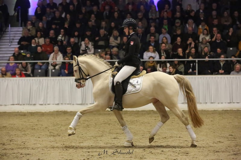 Cashcode is a son of Caramel WE, a champion stallion, state champion, and federal champion. His dam, Carla, is a daughter of FS Champion de Luxe x FS Don’t Worry, from a highly decorated mare line that has produced numerous internationally successful and awarded sport ponies. Cashcode was licensed at the Ponyforum licensing and is recognized nationwide. In 2021, he won riding horse classes against large horses, receiving a 9.0 for rideability. He placed in the final of the Westphalia Championship and participated in the Federal Championship. At the performance test in Münster-Handorf, he received the highest rideability score among all participants, becoming a performance stallion. In 2022, he achieved success in dressage tests at level A and qualified for the HKM Federal Championship. At the 2023 Federal Stallion Show of German Riding Ponies in Berlin, he was awarded a 1d prize and was the best Westphalian pony stallion in his age class in the dressage competition. Cashcode won two final qualifications for the HKM Federal Championship of 6-year-old dressage ponies in 2023. He also placed in dressage tests at level L against large horses. His first FEI placement underscored his success, with Kiana Joy Hoyer, who has been riding the charming Perlino since 2022, making these achievements possible. In 2024, the pair achieved numerous successes at level L. Cashcode has been covering for four years and will be available through Celle State Stud with fresh semen in 2025. His foals are not only beautiful but also very strong movers. His first offspring are now under saddle, and our expectations have been fully met—the rideability of his progeny is exemplary with excellent interior values—truly dream ponies. Cashcode consistently passes on correct conformation, great color variety, and splendid type expression. He is also approved for warmblood breeding and is often used for warmblood mares, producing consistently successful foals. Cashcode was in high demand in 2024, and his foals were sought after. Cashcode possesses the double cream gene but has not yet produced offspring with blue eyes. The colors range from palomino, buckskin, and dun with beautiful markings in a splendid presentation. His quality of movement and jumping ability make him a dual-talented sire with that certain extra. Semen orders can be placed through Celle State Stud - Breeding Station Verden or Ms. Susann Heise.