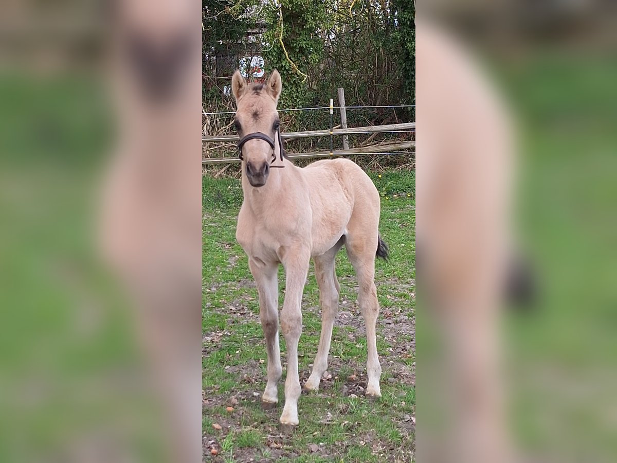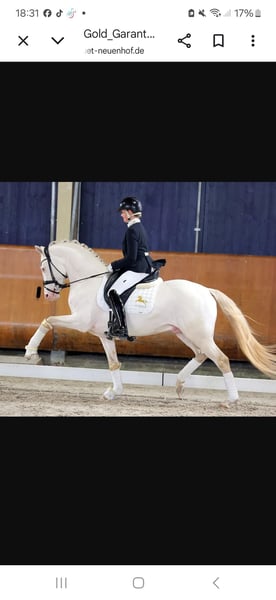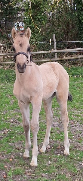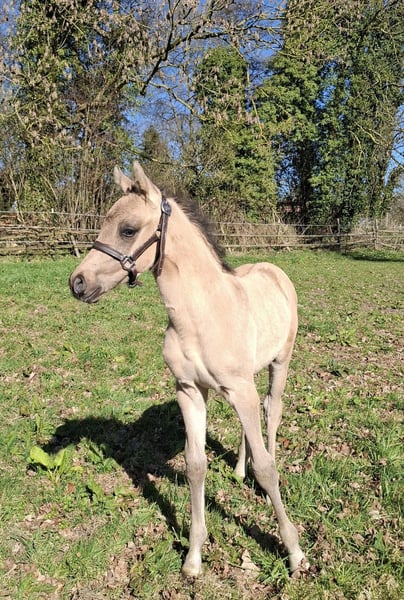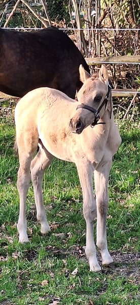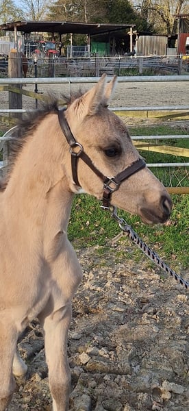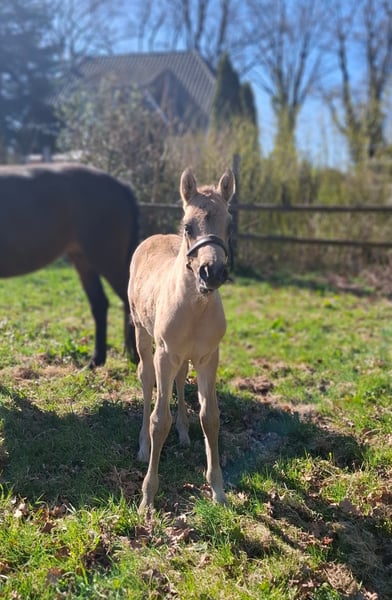Wir bieten dieses vielversprechende Hengstfohlen mit einer Top-Abstammung zum Verkauf an: Der kleine Hengst ist am 18.März 2026 bei uns geboren und wächst nun auf unserem Bauernhof mit vielen Tieren, Hunden, Katzen, Treckern, Lkw etc im Herdenverband mit anderen Stuten und einem Wallach auf. In den kommenden Wochen wird er weiter das Fohlen-ABC lernen. Bereits jetzt lässt er sich halftern und am Strick führen. Er ist sehr menschenbezogen, aufgeschlossen, freundlich und absolut unkompliziert. Die Abstammung lässt keine Wünsche offen: Der Vater Gold Garant ist mehrfacher Champion geworden und seine Nachkommen zeigen sich hoch erfolgreich. Die Mutter , 1,48 m, stammt von Dimension AT ab, welcher für seine Bestpunkte in allen drei Grundgangarten bekannt ist und ebenso als Champion glänzte. Ebenso zeigt sich in dieser Linie immer wieder die besonders schöne Kopfform des Großvaters Ombri B (von Reese-Bornhorst), welche nun auch an dieses wunderschöne Hengstfohlen vererbt wurde. Dieser junge Mann wünscht sich ein liebes Zuhause, welches ein junges Pferd mit Potenzial, korrektem Gebäude, elastischen Bewegungen, hervorragenden Grundgangarten und einen ehrlichen Freund für`s Leben sucht. Er wird vermutlich im Endmaß bleiben. Ein Equidenpass liegt natürlich vor und der junge Mann wird im September regelmäßig entwurmt und geimpft übergeben. Der Name des Hengstfohlens darf selbst bestimmt werden - er muss lediglich mit dem Buchstaben G beginnen :-). Der Name wird dann auch so in dem Pass eingetragen. Auf den beiden letzten Fotos sind seine Eltern abgebildet:-) Über einen Besuch und ein Kennenlernen würden wir uns freuen!