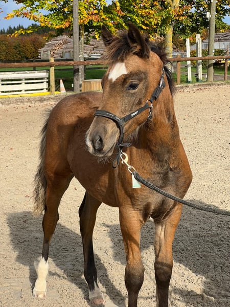 For sale is Dineo, a beautiful and typy riding pony foal born in May 2025. This charming stallion attracts attention not only due to his extraordinary coloring. The bay dun has a correct build and an extremely nice pony head, and so far shows very good movement quality in all gaits. The little pony stallion has already proven his potential at the foal show in Aachen, where he was awarded the silver foal premium, thus qualifying for the foal championship in Wickrath. Descended from Daiting's Smiley A, he has all doors open to him in terms of sports as well. The father impresses with excellent rideability and absolute willingness to perform. Dineo's mother, Erf Noblesse, descended from Noir der Luxe, shines with absolute reliability. Any child can ride ponies from this line carefree in the countryside or go to competitions. This line includes numerous ponies that have proven themselves in dressage and show jumping among children. The mother and grandmother, a Wesh B mare, who competed successfully up to A* level with a young girl, also participated calmly in major show events such as Equitana and CHIO Aachen. Dineo offers his future rider all possibilities and will simultaneously be the best friend, sports partner, buddy for shared rides, and surely a guarantee for a lot of fun. I am happy to answer any further questions. A viewing is possible at any time by arrangement. Location: Hürtgenwald. €4800 VB.
