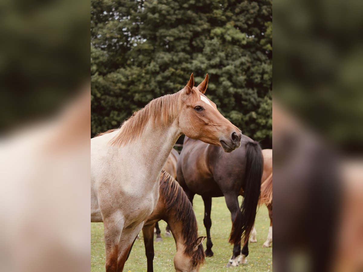 For sale is this 2015-born Red Roan riding pony mare. She is pregnant by Noble Dance NRW and is expected to foal in March. Arielle is an absolutely reliable and gentle pony, which has been used as a therapy horse with us. She impresses with her affectionate and cautious nature and is very easy to handle. She is solidly trained. The mare lives with us in a herd and demonstrates social skills, a calm temperament, and a very friendly attitude towards people. A great opportunity for breeding or as a family horse!