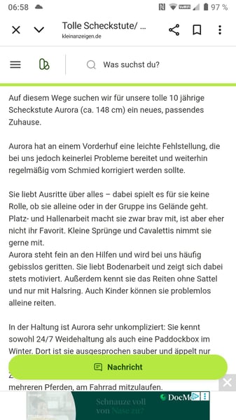 Aurora loves hacking out. Courageous and confident, she rides alone or in groups from the farm. In the arena, she is nicely ridden bitless, even by children. She has also participated in riding lessons for a period of time, which she handled confidently and unafraid. She easily navigates a few Cavaletti and also performs well in groundwork. Her mild left front conformation issue has not affected her so far and is regularly addressed. She is regularly dewormed.