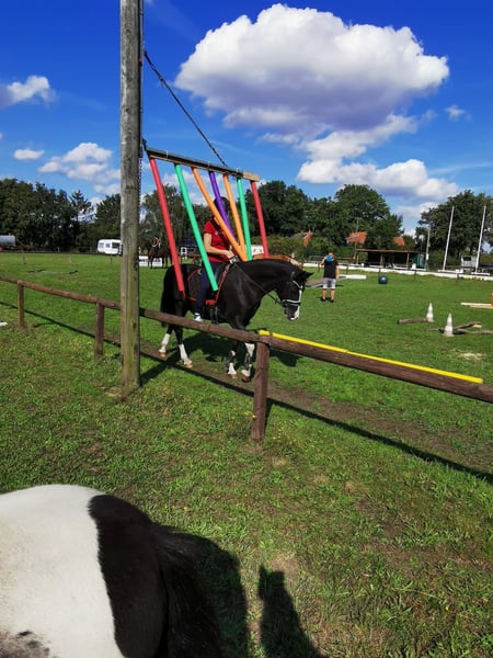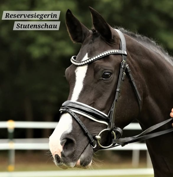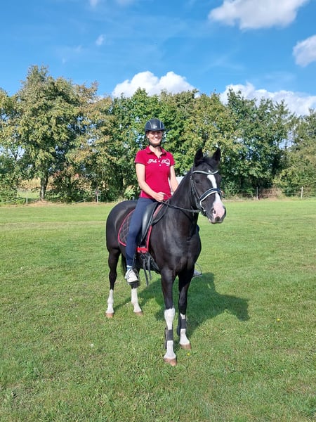 After careful consideration, I am looking for the right person for this beautiful black mare. Charisma is 10 years old and has been with me since weaned. She had a top-quality foal, has been on camping holidays with me, and is trained up to A-level dressage. Due to my full-time job and caring for two other ponies on my own, I need to part with one pony. She is simply too precious to spend most of her time standing around. Although she does everything with me—dressage, jumping, ground work, hacking alone and with a partner, competitions—she is not a pony for everyone! Sometimes she is very cool and can confidently navigate unfamiliar terrain for two hours, even for a 75-year-old rider. Other times, she can be spooky and easily startled. Therefore, a rider with plenty of experience and a secure seat is essential. She is happy to stay in her box at night and in the open stable during the day. In summer, she is on pasture 24/7. She is barefoot and can also be ridden in hoof boots when needed. Ideally, I am looking for an adult person who wants to continue her education without overwhelming her. She works very willingly and wants to do everything correctly. Although she is a XXL pony with a strong build, she is definitely NOT a load carrier. (She is well covered; I am 1.77 m tall.) Loading, hoof care, and handling are all easy with her. If you have enough horse experience, please get in touch. We can discuss everything further over the phone. Pedigree: From PAV Nutrix (Nemax x Benetton S), out of Zöthens Carina (Nitendo x Koyano x Ergano) Please contact me preferably via WhatsApp: 0174 4468951 Kerstin Lütge P.S.: SPACE BEFORE PRICE!