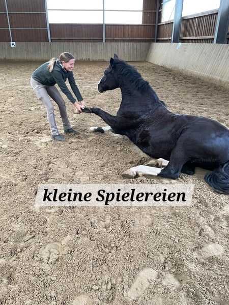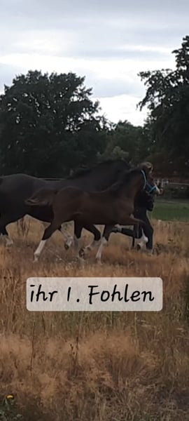 Nach reiflicher Überlegung suche ich auf diesem Weg die richtige Person für diese schwarze Schönheit. Charisma ist 10J alt u seit dem Absetzen bei mir. Sie hatte ein erstklassiges Fohlen, war schon mit mir im Campingurlaub u ist reiterlich auf A-Dressur Niveau. Da ich Vollzeit arbeite und noch 2 weitere Ponys in Eigenregie habe, muss ich mich von einem Pony trennen. Sie ist einfach zu schade, um die meiste Zeit rum zu stehen. Obwohl sie alles mit mir macht (Dressur, Springen, Bodenarbeit, Ausritte alleine und mit Handpferd, Turniere,...) ist sie kein Pony für Jedermann! Manchmal ist sie obercool u trägt einen 75jähr. Rentner sicher 2 Std durch fremdes Gelände, mal ist sie schreckhaft & leicht reizbar. Deshalb sollte man viel Reiterfahrung haben u sattelfest sein. Sie steht hier gerne nachts in der Box, da sie ihre Ruhe u Privatsphäre liebt & tagsüber im Offenstall mit den anderen 2. Im Sommer 24/7 Weide. Sie läuft barhuf u bei Bedarf auch mal mit Duplos. Ich wünsche mir für sie am liebsten eine erwachsene Person, die Bock hat, sie weiter zu fördern, aber nicht zu überfordern. Sie arbeitet nämlich sehr gerne & will alles richtig machen. Auch wenn sie ein XXL Pony mit starkem Fundament ist, ist sie definitiv KEINE Lastenträgerin. (Deckt gut ab; bin 1,78cm, 62 kg). Verladen, Hufe machen u Umgang ist alles easy mit ihr. Wenn du genug Pferdeverstand hast und gut reiten kannst, melde dich gerne, dann können wir alles Weitere telefonisch absprechen. Abstammung: Vom PAV Nutrix (Nemax x Benetton S) aus der Elite- u Staatsprämienstute Zöthens Carina (Nitendo x Koyano x Ergano), Sehr gerne über WhatsApp unter: 01744468951 Kerstin Lütge PS: PLATZ VOR PREIS!