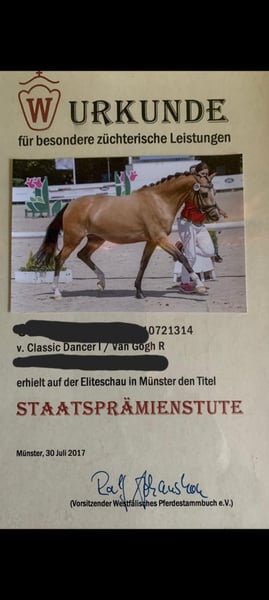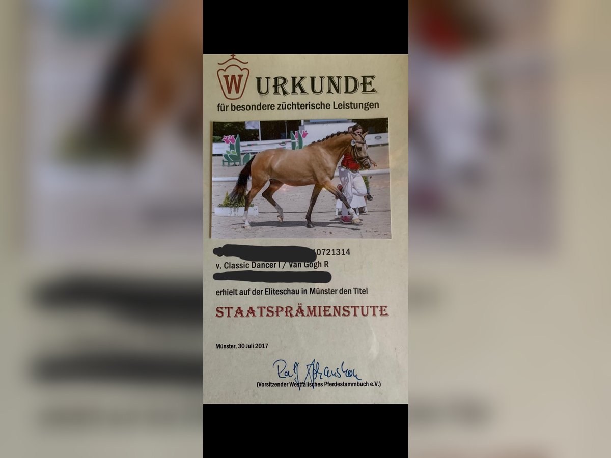 For sale: German riding pony mare, pregnant by Zauberlehrling, born in 2012, with a buckskin coat and a height of 14.4 hh. This elegant and well-mannered broodmare impresses with her friendly temperament. She has a fully approved full brother (reserve champion in Westphalia) and numerous successful offspring from her bloodline. The mare is being sold only to caring, experienced hands and can preferably remain in her familiar environment. Please feel free to contact me via WhatsApp if interested: +49 172 7349195.