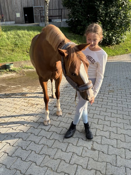 Ihr sucht ein dressurbetontes, kopfklares Pony, auf das zu jeder Zeit Verlass ist? Dann seid ihr bei unserer Lindsey genau richtig. Schweren Herzens müssen wir uns von unserer 12 jährigen Fuchsstute Lindsey trennen. Sie war unserer Tochter immer eine treue Partnerin und darf nun ein weiteres Kind, oder zierlichen Erwachsenen glücklich machen. Gemeinsam hat unsere Tochter mit Lindsey viel erlebt, angefangen bei diversen Lehrgängen (Dressur-, Spring- & Stangenlehrgang) über die ersten Turniere im Reiterwettbewerb, im Springreiterwettbewerb bis hin zur E Dressur. Aktuell lag der Fokus bei uns ganz auf der Dressurarbeit, doch Lindsey ist vielseitig veranlagt und zeigt auch im Springen viel Freude und Talent. Nicht nur außwärts konnten wir uns immer auf sie verlassen, sondern auch im Umgang sowie bei gemeinsamen Ausritten. Lindsey bleibt immer Kopfklar und passt auf ihren Reiter auf. Zusätzlich zum Training mit unserer Tochter, bekommt Lindsey professionellen Beritt. Hier sind Dressurlektionen der Klasse L sicher abrufbar. Wir suchen für Lindsey nur ein neues zu Hause, da sie leider nicht mitwächst und unsere Tochter auf ein Großpferd umsteigen wird. Röntgenbilder von 2021 ohne Befund vorhande. Bei Fragen sehr gerne melden. Gerne der erste Kontakt per WhatsApp.