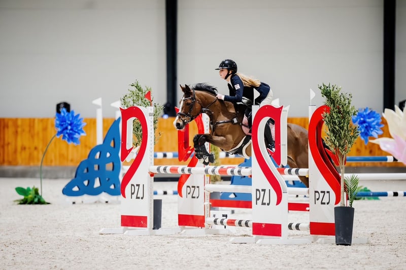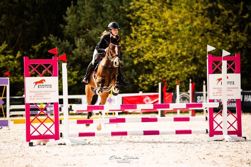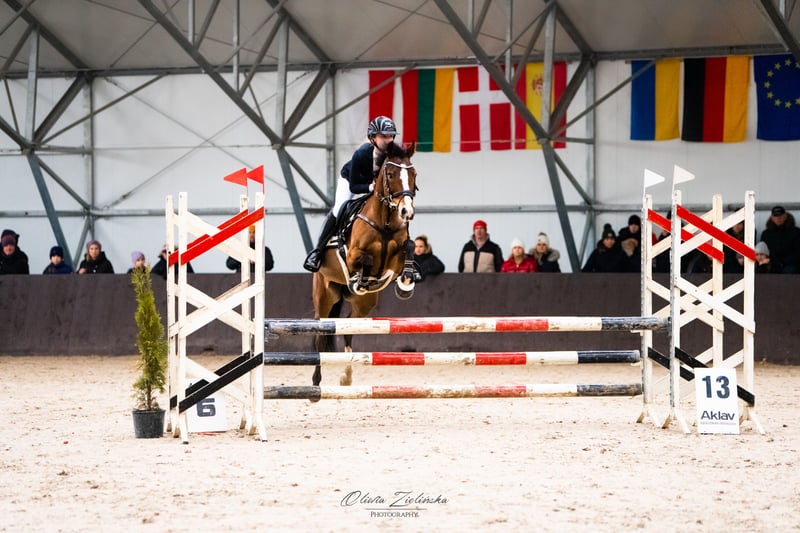 Yegua, DRP (Pony de doma alemana), 2010, 138 cm. Sincera, saltadora, muy precisa, no se detiene ni se deja llevar, ayuda en el recorrido de salto, salta desde cualquier posición, rápida cuando es necesario, pony con carácter de avance, compite en obstáculos de 90–95/100–105 cm (finales de enero de 2026, ganadora del final DIM D-bis), en casa en recorridos de 110 cm, con excelentes resultados en concursos por estilo de jinete, con buena cabeza. En entrenamiento regular y en muy buena forma, en paddock, con herraduras en las patas delanteras, bajo cuidado constante de veterinario, dentista y fisioterapeuta. Le gusta el contacto con las personas. Es muy amigable. Desde hace muchos años, tiene una visión reducida en un ojo, lo cual no le impide nada, como lo confirman sus resultados en competición. No tiene miedo a los ruidos, es fácil de manejar en los cuidados diarios, en el esquilado, herrado, visitas al veterinario, y en el transporte. Tranquila en competición. Siempre obtiene lugares destacados en concursos nacionales DIM, Ganadora en eventos de campeonato, entre otros: * 1º lugar - Campeona de Polonia categoría C, 2026 (HPP, Leszno) * 2º lugar – Vicecampeona de Polonia categoría C, 2025 (Jakubowice) * 2º lugar – Vicecampeona de Polonia categoría C, 2024 (Jakubowice) * 1º lugar – Campeona por equipos de Polonia para ponis, 2025 (Jakubowice) * 1º lugar – Campeona de Varsovia y Mazovia categoría C, 2025 * 3º lugar – Vicecampeona de Varsovia y Mazovia categoría C, 2026 * 4º lugar – OOM – ponis 2025 (Baborówko)