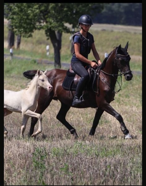 This charming 15-year-old dark bay mare is looking for a new sport partner. She measures 1.48 meters and competes reliably in dressage and show jumping at solid A level. Bred from Gasparo N out of an Antares N mare, she is uncomplicated and friendly in daily handling and has proven to be a good mother. She has already been presented at competitions. Currently, she is still foaling a foal, which will soon be weaned. Her adorable colt is also for sale. ID 4683814