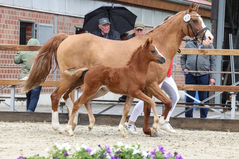 German Riding Pony mare – Chestnut, born 2025 This charming German Riding Pony mare is a promising young talent for dressage. Born in 2025, she impresses with her elegant appearance and friendly temperament. Her adorable face captures everyone's attention. Her character is simply a dream. Ideal for ambitious riders seeking a reliable partner for developing in the dressage arena or, following in her mother's footsteps, a safe children's pony. Please feel free to contact me for more information or if you are interested. A personal viewing can be arranged by appointment.