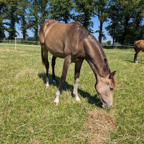 À vendre, une ponette de dressage allemande de qualité, née en 2023. Elle mesure actuellement environ 1,45 m et est encore en croissance, conformément à son âge. La ponette se distingue par ses bonnes allures de base, avec beaucoup de tact, de légèreté et d’équilibre, ce qui lui confère une excellente qualité de base pour le sport et une formation ultérieure. Elle a été primée en tant que foal. Elle connaît la selle, la bride, le licol d’entraînement ainsi que le tapis de monte et a déjà été longée. Actuellement, elle s’habitue au poids du cavalier, ce qu’elle accepte calmement, docilement et avec confiance. Dans l’ensemble, elle se montre très volontaire à l’apprentissage, calme et facile, même avec des enfants et des chiens. Elle a également montré une grande patience et une nervosité faible lors de ses séances de désensibilisation. Dans le quotidien, la ponette est amicale, proche de l’homme et agréable. Elle a été régulièrement présentée au maréchal-ferrant, ses dents ont été traitées la dernière fois à l’automne dernier, et elle est à jour de ses vaccinations. Origines : Double Cream x Top Zento x Nantano. Une ponette de jeune élevage sincère, avec une très bonne qualité de base et les meilleures conditions pour une formation douce et réussie. La ponette sera vendue uniquement à un foyer respectueux du bien-être animal, reconnu pour sa beauté et son approche éthique. PRIORITÉ AU PLACE, PAS AU PRIX. Pour plus d’informations, photos ou vidéos, n’hésitez pas à nous contacter.