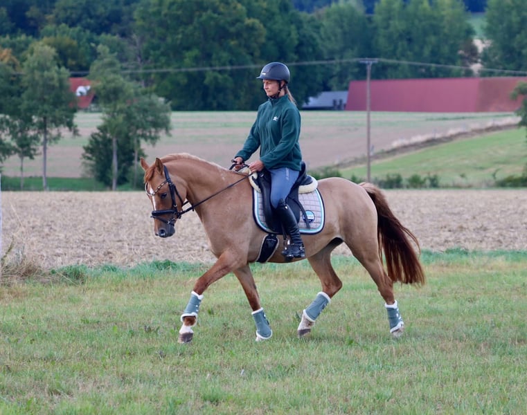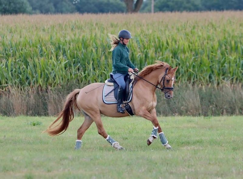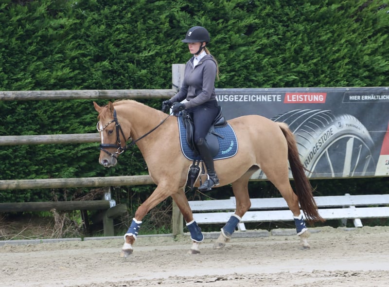 Steverheides Day-Lika – Fuchsfalbe mit Charakter und top Röntgenbildern 3-jährige Stute, ca. 1,46 m Day-Lika ist eine typvolle, kompakt gebaute Fuchsfalbe mit Dun-Gen – freundlich, nervenstark und neugierig. Sie zeigt sich von Anfang an unerschrocken, kooperativ und ausgeglichen: ein echtes Verlasspony in der Mache. Abstammung: FS Day by Day (FS Don’t Worry x FS Champion de Luxe x Dornik B) aus der Verbandsprämienstute Angelika JF (Golden Atreju x Calvin Klein). Diese sport- und zuchterprobte Linie spricht für sich. Im täglichen Umgang überzeugt sie durch ihr ruhiges Wesen, klaren Kopf und hohe Sozialverträglichkeit. Sie lebt aktuell in einer gemischten Offenstallherde und wurde artgerecht in einer kleinen Jungpferdegruppe aufgezogen. Day-Lika wurde altersgerecht anlongiert und angeritten. Die kleine Reiterin auf dem Foto ist erst 10 Jahre alt und konnte die Stute ohne Probleme frei reiten. Auch im Gelände zeigt sie sich unerschrocken: Weder Fahrräder noch Traktoren beeindrucken sie – eine „coole Socke“. Brandneue Röntgenbilder (18 Aufnahmen inkl. Rücken) vom September liegen ohne Befund vor. Ein tolles Familien-, Kinder- oder Kutschpony mit viel Potenzial. Persönlicher Kontakt gewünscht – keine Videos vorhanden.