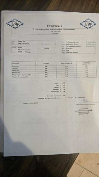 Wunderschöne 4 jährige Ponystute. Siegerin ihrer Stutleistungsprüfung mit einer Gesamtnote von 8.7 Einzelnoten: Trab 9,0 Galopp 9,0 Schritt 8.5 Rittigkeit 9,0 Fremdreiter 8,0 Springanlage 9,0 Reitpferdeprüfung hochplatziert mit über 8er Noten. Abstammend von FS Champion de Luxe x The Breas My Mobility BP. Eingemessen mit 147cm. Guter Tüv. Bitte telefonisch melden unter 0179 7002982. MwSt ausweisbar, 35🥕vb