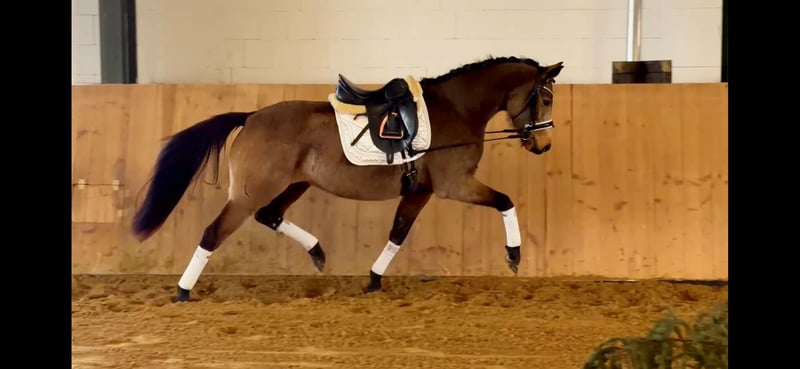 Zum Verkauf steht eine wunderschöne Pony-Stute im XXL-Format mit einem Stockmaß von 152 cm. Sie besticht durch ihre traumhafte Buckskin-Farbe und ihr liebenswertes, freundliches Wesen. Aktuell steckt sie noch im Winterfell - darunter verbirgt sich eine echte Schönheit mit Ausstrahlung und Charme. Sie kennt die Grundlagen im Umgang, Ist brav und unkompliziert im täglichen Handling Geht zuverlässig in der Halle sowie auf dem Außenplatz motiviert und bereit, weiter gefördert zu werden Ein vielversprechendes Talent zum sportlichen Reitpony. Mit weiterer Ausbildung entwickelt sie sich sicher zu einem tollen Partner für ambitionierte Reiter. Frisch getüvt (tierärztlich untersucht) Ein Pony mit Herz, Format und Perspektive - ideal für Reiter, die ein charmantes Nachwuchspony mit Potenzial suchen. Abstammung: Rivers Dancing AS x Santano x Sandro Hit x Jazz Weitere Informationen gerne auf Anfrage.