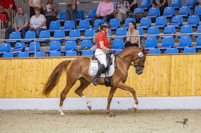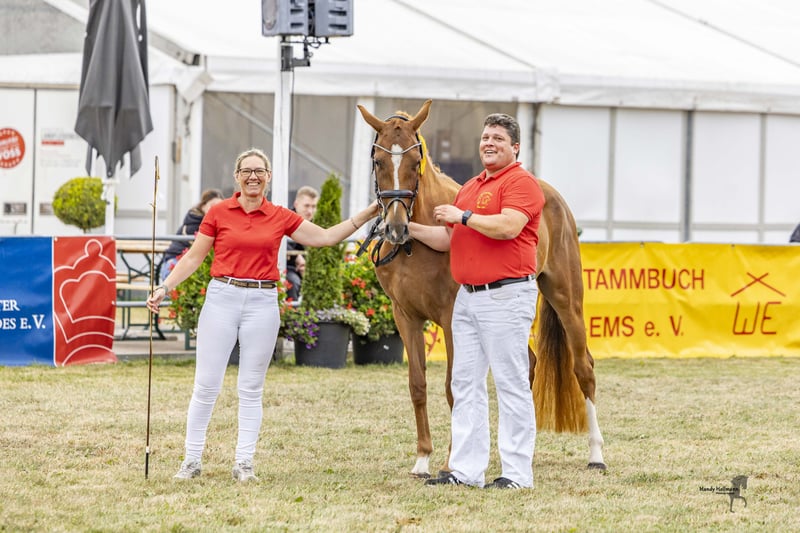 For sale is a beautiful, talented riding pony mare in XL format. This young lady impresses not only with her appealing color but also with her friendly disposition and willingness to learn. She is well-suited for dressage and already shows promising signs in her training. The mare is easy to handle, well-behaved in the stable, and has a positive attitude towards work and training. She is suitable for both experienced riders and ambitious riders who wish to further develop her potential. Deichdeern has successfully completed her SLP in Vechta with a score of 7.43. Furthermore, she was awarded the State Premium at the Elite Mare Show of the Pferdestammbuch Weser-Ems e.V. and placed 1b in her ring. If you are interested or need further information, please feel free to contact me. Sale only to nurturing hands. We look forward to your message!