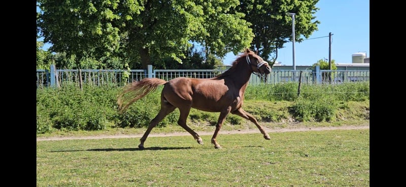 Dialia ist eine wunderschöne Dunkelfuchstute mit feinem Köpfchen. Im Mai 2025 startete ihre Ausbildung unter dem Sattel. Bereits im Sommer nahm sie mit Erfolg an einem WBO Turnier mit Reiterwettnewerb und Dressurreiterwettbewerb teil. Sie zeigte sich brav beim Verladen und Anhänger fahren, nervenstark in fremder Umgebung, unkompliziert auf dem Abreiteplatz und lieb in der Abteilung. Auch im täglichen Leben Zuhause ist sie unkompliziert, kennt verschiedene Reiter, lässt sich auch von Longieranfängern sehr lieb longieren und ist natürlich auch beim Putzen und fertig machen lieb. Auf dem Paddock hat sie gerne etwas persönlichen Raum und nicht jedes Pferd soll ihr zu nahe kommen. Beim Ausreiten in Feld, Wald und auch Straßenverkehr ist sie gelassen und ruhig. Egal an welcher Stelle. Ihre drei sehr guten Grundgangarten bieten die Möglichkeiten für eine sportliche Karriere. Kennenlernen und Probereiten ist nach telefonischer Absprache möglich. Beim Anklicken auf die automatische Antwort bitte eine Telefonnummer angeben.