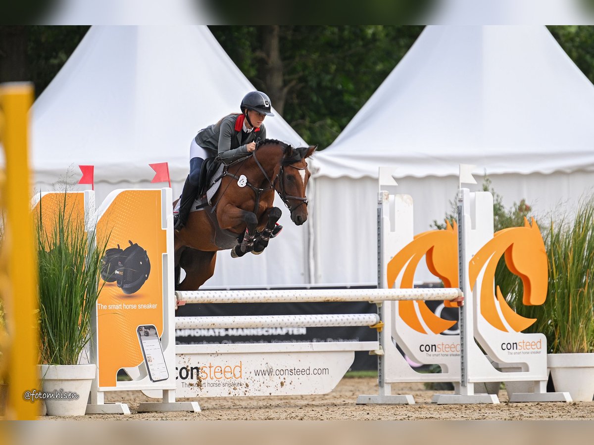 We are offering our homebred, five-year-old, stunning, successful, and expressive show pony mare, *Noblesse Oblige FHH*. She has already competed successfully in numerous jumping competitions at the A* and A** levels, consistently earning high scores. In 2025, she qualified for the German Pony Championships for five-year-olds, where she received consistently excellent evaluations. Noblesse is very brave, ambitious, and completely unfazed by external influences in the arena. She is always willing to work and eager to perform, and her sporting attitude indicates she should be further developed and supported. In handling, Noblesse is very well-behaved, easy to load, and lunges reliably. Out on forest rides, she proves to be as dependable as in the show ring. She jumps over logs and crosses streams and water without hesitation. Additionally, Noblesse has three very good basic gaits. She is familiar with turnout in both groups and alone; she is open-minded and friendly towards farriers and veterinarians, as she is with all people. Due to her age and training level, Noblesse is not suitable for beginner riders. Noblesse has an exceptionally sportily interesting pedigree: Her sire, *FS Numero Uno*, is highly successful in dressage competitions up to S-level and has numerous successful offspring in top-level sport. Her dam, *Deydoo L*, was successful as a young horse at the Bundeschampionat and achieved countless victories and placements over many years, including international success in the advanced pony class at M** level, culminating in the German Pony Championships. *Deydoo L* consistently demonstrated maximum reliability alongside her enormous ambition and top attitude. After her career in high-performance sport, she has successfully supported many of her offspring in their start in show jumping. Noblesse’s half-brother, *Doctor Strange*, is highly successful in pony jumping competitions in Poland.