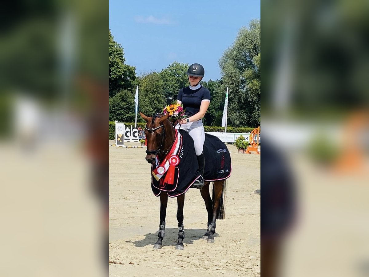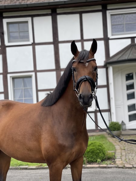For sale is our 7-year-old German Riding Pony mare, Rina DH. The charming mare impresses both with her temperament and her previous sporting achievements. She has already won an 8.5 in the Class L show jumping pony test. In 2024, she was placed in the final of the five-year-old show jumping ponies at the German Federal Championships. Additionally, she has been placed multiple times in A** show jumping competitions. A special highlight of her career is her title as Westphalian Champion 2024 in the five-year-old show jumping ponies, as well as the Vice Westphalian Champion title 2025 in the six-year-old show jumping ponies. Rina is very light in the hand, always motivated during work, and shows great overview along with a strong scope for jumping. She is very cautious at the fences, yet well-equipped with enough talent. She always aims to please her rider and presents herself as honest and eager to perform. She has also been introduced in dressage and has achieved placings in WBO E- and A-level dressage tests. In daily handling, Rina is well-behaved and uncomplicated. She is shoe-friendly, loading-friendly, and easy to handle. She is an excellent pony for ambitious young riders seeking a successful and reliable sport pony.