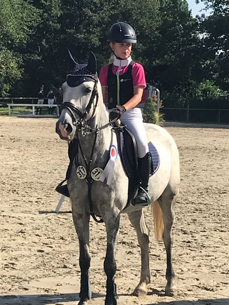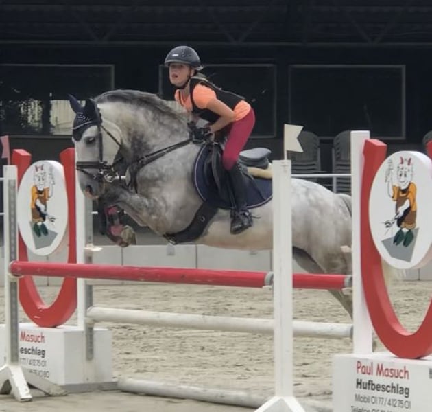Springpony bis 115 cm platziert Da meine Tochter lieber Großpferde reitet, bieten wir im Auftrag des Züchters eine sympathische 2018 geborene Ponystute an. Sie ist eingetragen mit 1,46 m und Springen bis L gegen Großpferde platziert, wo ihre Grenze aber noch lange nicht erreicht ist. Sie hatte 4jährig erst ein Fohlen und ist dann angeritten worden. Im Parcours ist sie mit Go ausgestattet, will aber trotzdem geritten werden und ist daher nicht für die „kleinsten“ Reiter geeignet. Im Umgang und bei der täglichen Arbeit ist sie brav und geht auch artig und gern allein und in der Gruppe ins Gelände. Reiten ohne Sattel und dergleichen kennt sie auch. Sie kommt direkt vom Züchter, hat aber keine eingetragene Abstammung. Der Vater war ein Nachkomme des Colestus und, bevor er in die USA verkauft wurde, bis Springpferde L platziert, die Mutter eine Ponystute, ebenfalls ohne Abstammung und bis A** im Springen platziert und Seriensiegerin in E Springen (sie kann auch bei uns besichtigt werden). Eine Besichtigung und Probereiten ist nach Absprache möglich.
