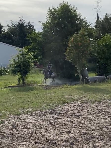 With a heavy heart, I am selling my self-bred German Riding Pony mare Nö due to a lack of time. Unfortunately, I can no longer do justice to her as she deserves. Nö is 9 years old and 1.44m tall. She is very people-oriented. Nö enjoys being out on the trails and jumps over all kinds of obstacles there. Unfortunately, she has developed a skin condition in recent years. Otherwise, Nö has no known illnesses or problems. She is not being sold as a pure children's pony or for beginners. She is looking for loving, supportive hands without competition ambitions. Currently, she is not in training. Her teeth were done in December 2024. She spends the summer 24/7 in the pasture and in winter in a loose housing system. This is not an urgent sale; she will only be placed in the very best hands and the right home. No dealers or riding schools.
