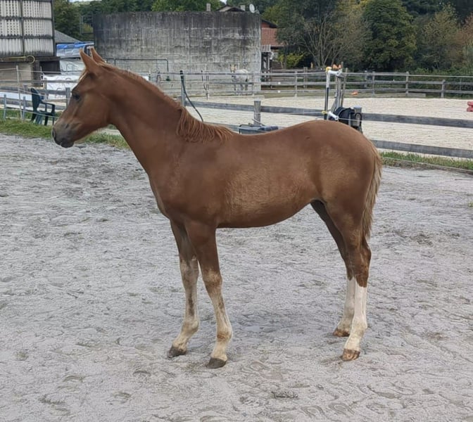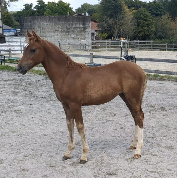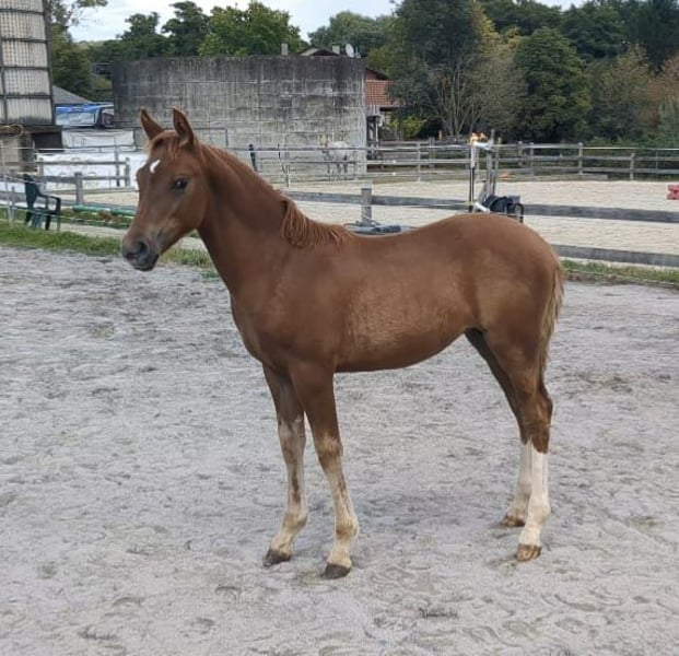 Dalla nostra allevamento offriamo una bellissima puledra con due zampe posteriori uniformemente bianche e stivali alti, figlia del doppio campione Mescal. Il puledro ha tre ottime andature, è sveglio, sicuro di sé e molto socievole. Il padre Mescal è stato campione nazionale dei pony da salto di 5 e 6 anni ed è attualmente attivo con successo nella disciplina del dressage fino alla classe S. La madre Princess Peach è attiva con i nostri bambini, passando da cavalieri di salto WB a salto di classe M con successo. Ha la giusta attitudine per lo sport, è sempre un ottimo compagno e un vero tesoro nel maneggiarla. Inoltre, ha 3 ottime andature, da sottolineare la sua fantastica galoppata ampia. La nostra Missy è quindi adatta a tutte le discipline, una vera tuttofare!