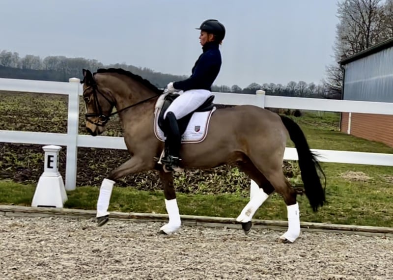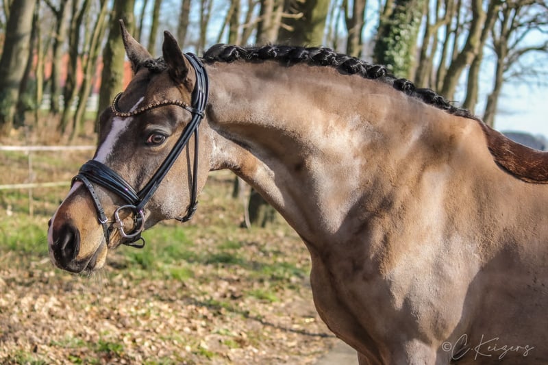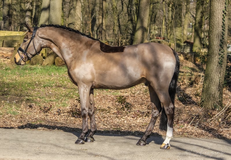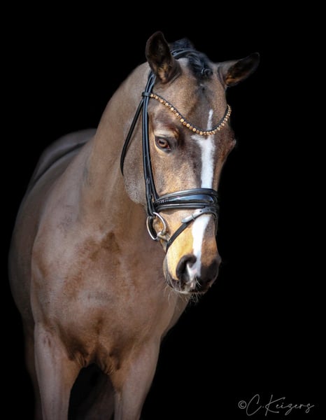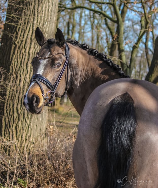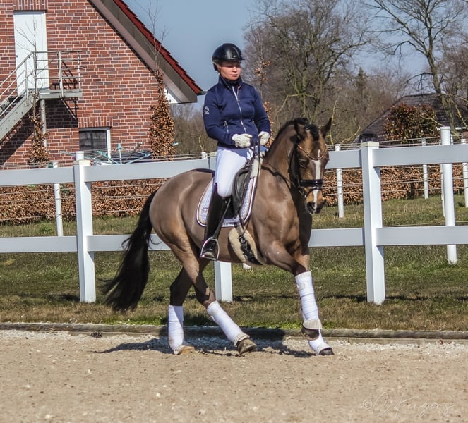 With the 6-year-old "Dance For Gold" we have a beautiful gelding in dream look to offer. In addition to its great presentation, it has three good basic gaits, as well as an absolutely great interior. In his dealings, he is super well-behaved and can not be disturbed by anything. Even small children can easily guide, clean and daddle it. "Danci" was carefully built up in the years before and was able to grow out in peace and enjoy his youth. Now he is physically grown and ready for new tasks. Due to its presentation and its frame, it also easily covers adult riders. On the paternal side and also from the mother father, "Danci" combines the best performance lines and is therefore suitable for the upscale pony sport. His father "Dance For Me" was already able to win the Hamburg Pony Derby with his rider at the age of 6. His mother father "Danny Gold" can also boast many placements up to class L and his numerous descendants are just as successful in pony sports. With appropriate funding, a great sports pony matures here. As a 3-year-old there was a very good 20 pictures Tüv available. If you are seriously interested, you are welcome to 491707941333.