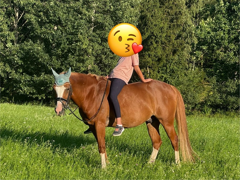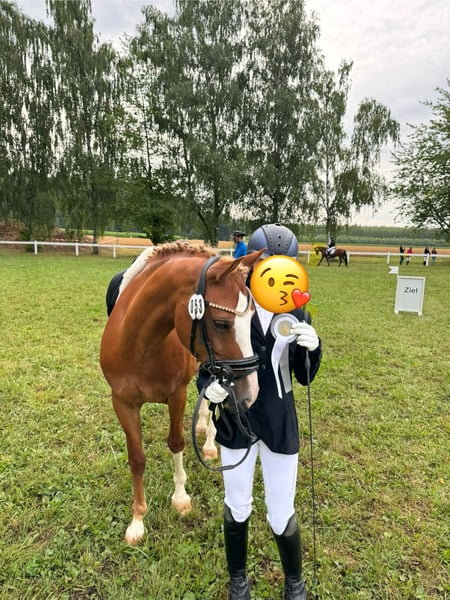 Da unsere Tochter viel zu schnell gewachsen ist suchen wir für unser 11 jähriges deutsches Reitpony schweren Herzens neue Möhrchengeber. Seit 5 jährig in unserem Besitz, wir kennen ihn seit Fohlen und haben ihn direkt vom Züchter. Ist sowohl im Umgang als auch unter dem Sattel superartig. Unsere Tochter hat von der ersten longenstunde an auf ihm reiten gelernt und er hat sie nicht ein einziges Mal hinunter befördert, buckeln, steigen, durchgehen o.ä. Macht er unter dem Reiter niemals. Geht supergern ins Gelände-mit oder ohne Sattel-und ist hier eine Lebensversicherung. Läuft artig in der Halle/Platz, auch in fremder Umgebung (Turnier) und ist auch von unerfahrenen Reitern problemlos zu händeln. Springt auch gern was von uns aber nicht weiter gefördert wurde. Barhuf. Zähne frisch gemacht. War bei uns nie krank/keine Vorerkrankungen bekannt. Wir wünschen uns für ihn einen dauerhaften Platz mit täglich koppelgang oder offenstall, sozialkontakt und wo er Familienmitglied und nicht Sportgerät ist. Nur an Bestplatz!!! Keine Händler, kein Schulbetrieb. Maßgefertigter Röösli-Dressursattel (Modell Titlis) und sein weiteres sehr hochwertiges Zubehör sind dabei.