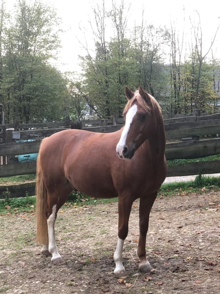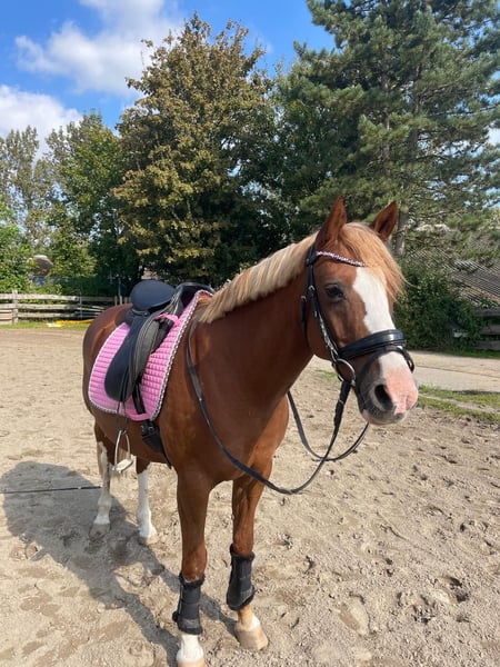 We are selling our German Riding Pony gelding (born 13.05.2010, 1.42 m, chestnut). He is a real eye-catcher with solid training: • Confident in dressage at level A, also completed show jumping at level A* • Competition experience until 2021 • Ridden mainly for leisure and in riding lessons since 2021 • Regularly in training, well-groomed, and healthy Character: He needs some time to get used to his person but quickly builds trust. When riding, he is somewhat forward-going but can be motivated and can move quickly and energetically. Ideal for riders looking for an honest, safe pony that doesn't "explode" right away. Not a children's pony. We recommend him for teenagers from 12 years old. Area of use: • Leisure • Dressage lessons • Trail riding in the woods/terrain Lucky is regularly seen by the farrier (no shoes) and all his vaccinations are up to date. Price: Negotiable €7,900 It is important to us that he goes to good hands where he will be further developed and bring joy.