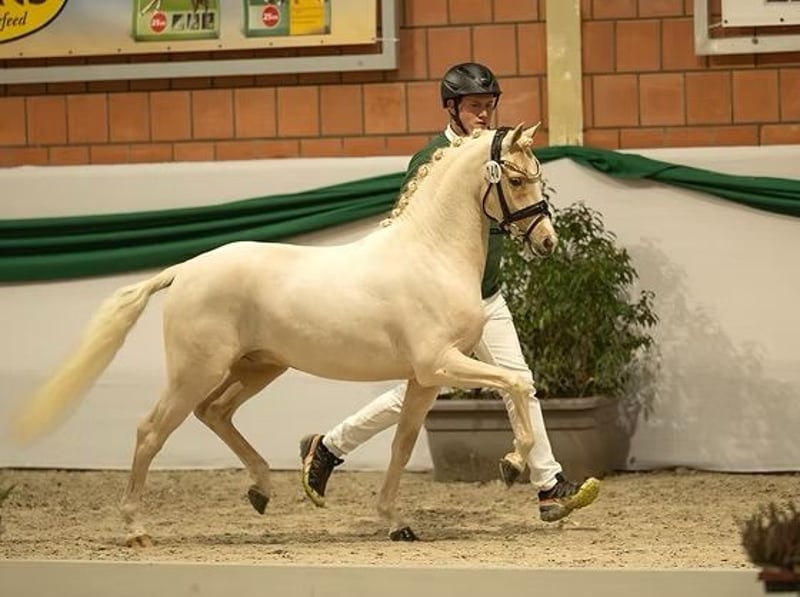 Here is the perfect small-sized sport pony for ambitious children for sale! With a height of 138 cm, an ideal intermediate size, excellent movement quality, very good jumping ability, and a fantastic work ethic! A pedigree to take your breath away, easily ridden through the neck. Formerly licensed, this little superstar spent its first year at our breeding station passing on its outstanding genes—now, full focus on further training. We look forward to serious inquiries. The pony's name says it all: Assenmachers Goldstück ❤️