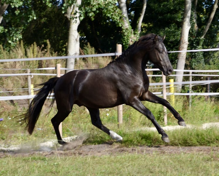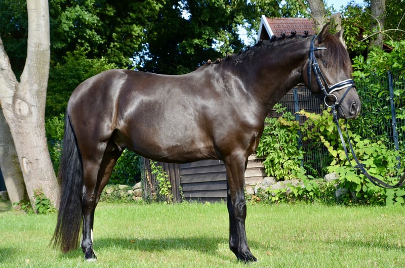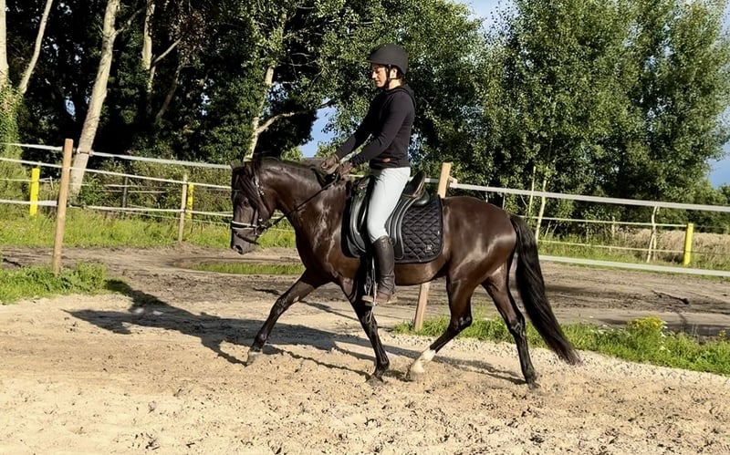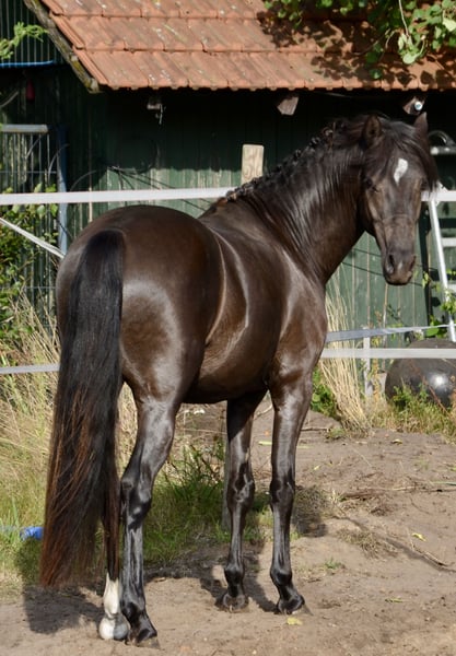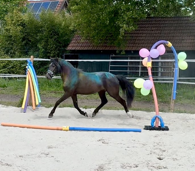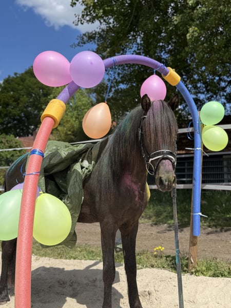 For sale is this super sweet and cuddly 3-year-old pony gelding with a great presence! He has grown up in a herd environment and is now mastering his training with flying colors! Pedigree: Father Cayuga San WE, Mother Lambada Casi is a registered black dun (blue dun, gray dun) Height: currently about 1.39 m The first steps under saddle have been taken, including problem-free mounting and dismounting, lunge work, tarpaulin training, and pole training. He behaves excellently with the farrier (barefoot) and loads easily. Now he is waiting for someone who enjoys continuing his training!