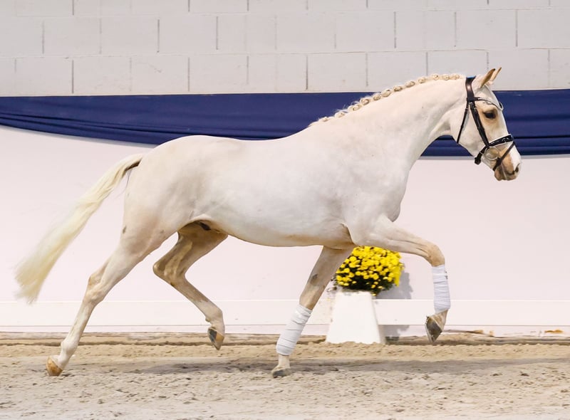 In unserer Kollektion stehen streng selektierte Youngster f�r alle Anspr�che: Ausbildungs-, Zucht- und Kinderponys Hier gelangen Sie zur Gesamtkollektion: https://ponyforum.auction Hier kommt Nesquick angeflogen! Wenn er los trabt, zieht er alle Blicke auf sich. Schwungvoll und mit richtig Gummi fliegt der hübsche dreijährige Palomino durch die Bahn, was für eine Bewegungsdynamik! Und auch der bergauf gesprungene Galopp ist von erlesener Sorte, die Hinterhand fußt vorbildlich unter und gibt Kraft. Schon als Fohlen war Nesquick ein auffälliges Pony und er konnte sich beim Deutschen Reitponyfohlenchampionat weit vorne platzieren. Er ist sicher im Handling, kennt erste Longenarbeit und kann jetzt direkt in die Ausbildung starten - um dann in der nächsten Saison sicherlich erfolgversprechend in Aufbauprüfungen eingesetzt zu werden.