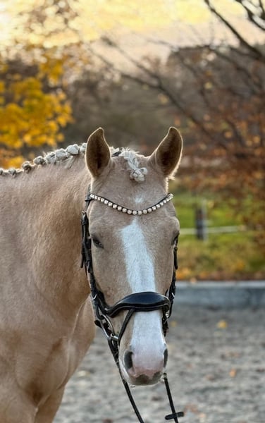 For sale is a very willing and talented Palomino gelding. Goldie impresses every day with his eagerness to work. He is currently in professional training and can be viewed at any time. He is 5 years old, A-certificate qualified, and already mastering basic L-level dressage movements. He is well-behaved in the terrain and enjoys variety. He also handles small jumps, although he has not been further trained in jumping. He is very affectionate with people, loves cuddling, and enjoys the company of his handler. He is friendly and social in his interactions and gets along very well with other horses. In addition to riding, groundwork and handwork have been carried out with him. He is currently barefoot but is also familiar with shoes. He can be ridden by children or teenagers, but should continue to be regularly ridden by an adult due to his age. He shows curiosity towards different surfaces, tarps, a large ball, or even when he slips from behind – all of which do not disturb his calm. He also loves water and happily walks through puddles. Farrier work, loading, and veterinary visits are no problem at all. He measures 1.47 meters at withers.