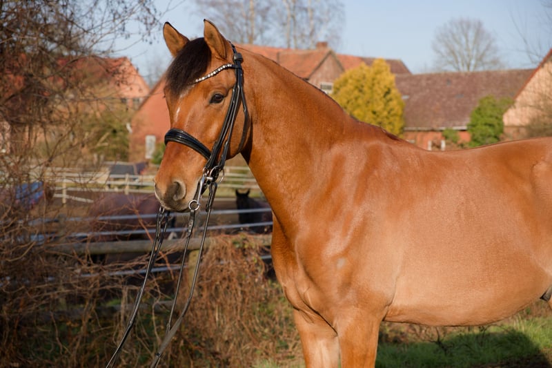 Zum Verkauf steht der ausdrucksstarke Ponywallach Morgensterns D’Artagnan, bald 8-jährig, in der besonderen Farbe Braunfalbe und mit einem Stockmaß von 1,53 m. Er vereint Qualität, Ausstrahlung und Arbeitsbereitschaft. „Darti“ wurde 3-jährig (2021) in Elmshorn als Hengst gekört, was seine hervorragenden Bewegungen, Zuchtqualität und sein fabelhaftes Exterieur unterstreicht. 5-jährig wurde er gelegt und ist im Umgang mit Stuten unkompliziert. „Darti“ ist ein Sohn des Ausnahmevererbers FS Don’t Worry, bekannt für Rittigkeit, hervorragende Grundgangarten und sportliche Leistungsbereitschaft. Seine Mutter ist FS Carmelita, eine Tochter des Elitevererbers FS Champion de Luxe, der als Bundeschampion zahlreiche gekörte Söhne, Staatsprämienstuten und sportlich erfolgreiche Nachkommen gestellt hat. Er ist Vollbruder von Steendieks Morgensterns Dalai, einem hochdekorierten Hengst mit Bundeschampionatsplatzierungen und erfolgreicher Nachzucht – ein klarer Beleg für die Qualität dieser Linie. „Darti“ verfügt über sehr gute Grundgangarten, wobei insbesondere sein hervorragender Schritt hervorzuheben ist – taktrein, raumgreifend und von hoher Qualität, auch für die weitere dressurmäßige Ausbildung. Sportlich ist er Dressurpferde-A-platziert und aktuell auf L-Niveau. Er zeigt sich motiviert, lernbereit und leistungswillig, benötigt jedoch eine sichere, erfahrene Reiterhand. Nicht für Anfänger oder ängstliche Reiter geeignet, ideal für ambitionierte NachwuchsreiterInnen oder erfahrene ReiterInnen. Im täglichen Umgang ist er brav, schmiede- und verladefromm. Er geht barhuf und ist vollständig geimpft und regelmäßig entwurmt. Eine AKU aus 2023 ohne Befund inklusive Röntgen von Beinen und Rücken liegt vor. Aktuell steht er tagsüber in einer gemischten Gruppe und ist nachts in der Box untergebracht, kennt im Sommer aber auch 24/7 Weide – sozialverträglich und Herdenhaltung gewöhnt. Ein Pony mit gekörter Qualität, XXL-Maß, besonderer Farbe, hervorragenden Grundgangarten, sportlicher Perspektive, exzellenter Abstammung und sehr gutem Gesundheitsstatus – ein echter Hingucker mit Potenzial.