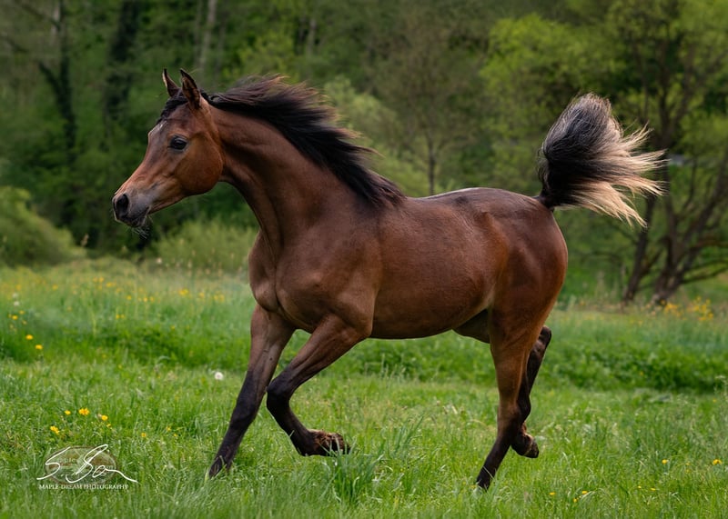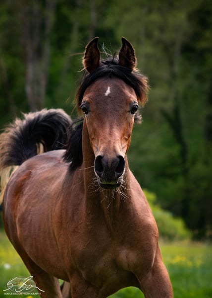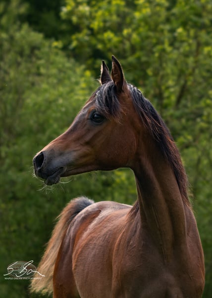 Rajiyyah is a stunning, typy, correctly conformed pure Egyptian filly with a gentle, human-oriented character and an exceptionally interesting pedigree for breeding. She is absolutely well-built, with solid foundations, a strong body, and a very good topline. Her refined, typy, dry face features large, expressive, dark eyes and a delicate muzzle. Her head flows into a fine neck that transitions smoothly into a well-shaped, elegant neck. Her powerful body, with well-angulated shoulders and pelvis, and an excellent topline, stands on solid foundations with stable hooves. Her movements are expansive, elastic, and lively, with three well-defined basic gaits. She loves to show off and is very expressive. Rajiyyah has a sweet temperament, enjoys cuddling, and strives to please. She is intelligent, quick to learn, and eager to pick up new things. All these qualities make Rajiyyah very promising as a future broodmare and for shows. But she also has great potential as a riding horse for endurance and demanding leisure riding. She will be a reliable companion through thick and thin. Both her parents and other relatives are good riding horses. Rajiyyah is familiar with ground work, hoof care, trailer loading, children, cattle, cats, dogs, large machinery, road traffic, etc.—in short, everything a young horse should know. She grew up in a herd and is therefore very well socialized.