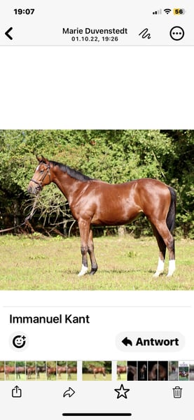 4-letni, bardzo bystry ogier pełnej krwi z dobrymi ruchami. Immanuel Kant nie jest szczególnie uciążliwym ogierem i przebywa z wałachami na pastwisku. Dopiero niewiele pracował pod siodłem, uczy się ekstremalnie szybko i chętnie współpracuje. Jest łatwy w jeździe. Oczywiście zna załadunek na przyczepę i ciężarówkę. IMMANUEL Kant jest w pełni zdrowy, nigdy nie miał kontuzji ani alergii. Ma wystarczający potencjał do wszystkich dyscyplin. Ma bardzo dobre kopyta i porusza się swobodnie.