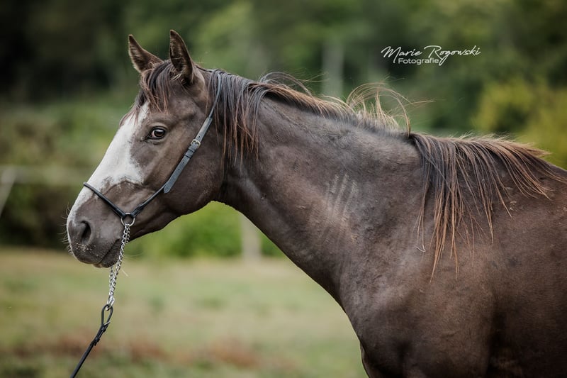 Pur-sang anglais en Smoky Black (porteur de crème simple + porteur d'Overo) | né en 2022 | actuellement en croissance Pur-sang anglais Génétique : E/_ a/a Cr/n OWL/n STUNED AGAIN XX est un jeune étalon pur-sang avec une génétique de couleur rare et un caractère amical. Il se montre attentif, calme, intéressé et aime s'approcher des gens sans être envahissant. Dans l'ensemble, c'est un jeune étalon curieux et sans complications. Il grandit dans un groupe de jeunes étalons d'âges mélangés, connaît un contact régulier avec les humains et est familiarisé avec les routines de base du quotidien – y compris la conduite, le chargement, le pansage et les soins des sabots non ferrés. Père : T.C.F. Palladium xx – l'un des rares pur-sang smoky cream au monde, élevé au Canada (True Colours Farm), actif chez nous dans l'élevage de couleurs. Mère : Just Stunning xx – jument pur-sang anglais avec statut de porteur de dessin Overo (OWL/n)