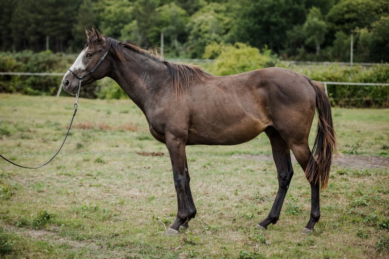Angielski pełnej krwi w Smoky Black (nosiciel prostego kremu + nosiciel Overo) | ur. 2022 | aktualnie w fazie wzrostu Angielski pełnej krwi Genetyka: E/_ a/a Cr/n OWL/n STUNED AGAIN XX to młody ogier pełnej krwi o rzadkiej genetyce kolorystycznej i przyjaznym usposobieniu. Jest uważny, spokojnie zainteresowany i chętnie podchodzi do ludzi, nie będąc natarczywym. Ogólnie rzecz biorąc, to bezproblemowy, ciekawski młody ogier. Dorasta w grupie młodych ogierów w różnym wieku, zna regularny kontakt z ludźmi i jest zaznajomiony z podstawowymi codziennymi czynnościami – w tym prowadzeniem, załadunkiem, czyszczeniem i pielęgnacją kopyt bez podków. Ojciec: T.C.F. Palladium xx – jeden z nielicznych na świecie smoky cream pełnej krwi, hodowany w Kanadzie (True Colours Farm), aktywnie uczestniczący w hodowli kolorystycznej. Matka: Just Stunning xx – angielska klacz pełnej krwi z nosicielskim statusem Overo (OWL/n)