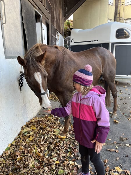 The mare "Kisses of Fire" is a large-framed 11-year-old Thoroughbred mare. She has spent several years in breeding (always uncomplicated with beautiful foals) and is now being retrained under saddle. She is relaxed, has a good temperament, a gentle nature, and is well-behaved in handling. We work with her according to the principles of natural horsemanship. She is familiar with groundwork, walks, and is herd-compatible. Grooming, leading, picking out her hooves, bridling, tacking up, and loading into the trailer are all done easily. She enjoys the company of children. Her horse passport shows that all vaccinations and examinations have been up to date since her birth. She is in excellent health and is looking forward to her new role as a riding horse, family horse, and possibly for breeding or as a broodmare in warmblood breeding. Last year, one of her three-year-old offspring was under saddle with us – a truly dream horse. Her price will increase with further training. Serious inquiries are welcome. By appointment, our "Kissy" can be viewed.