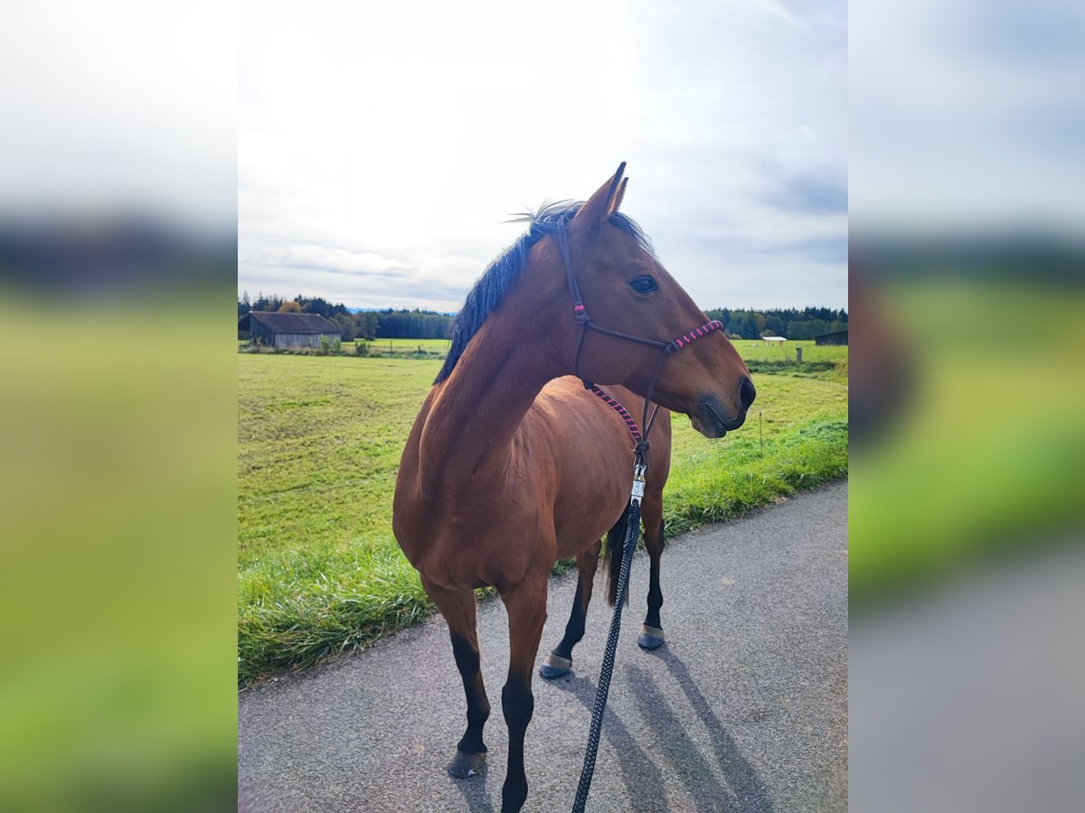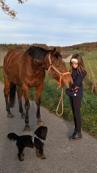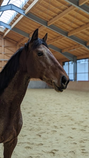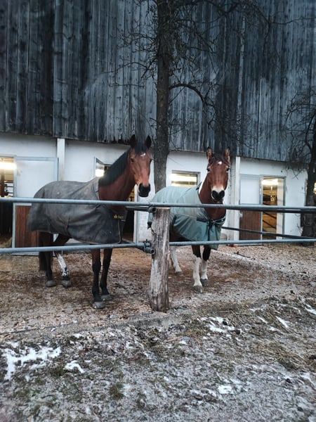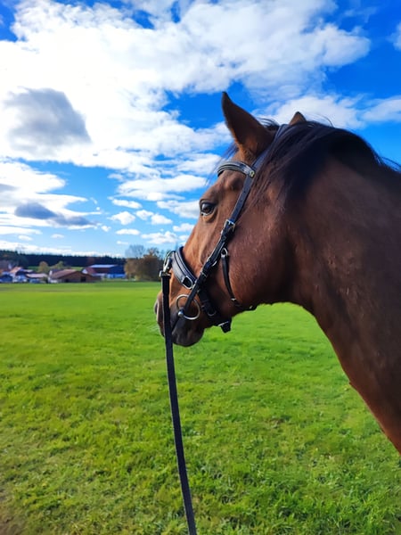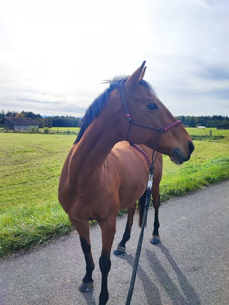 Wir suchen ein neues Zuhause für unsere englische Vollblutstute Bailey, geb 2014, ca. 1,65m. Bailey ist nicht einfach nur ein Pferd, sie ist eine echte Persönlichkeit und ein absolutes Herzenspferd für "ihren" Menschen. Was sie besonders auszeichnet, ist ihr toller Charakter. Sie ist extrem menschenbezogen, sucht immer den Kontakt und möchte ihrem Partner Mensch gefallen. Wer eine tiefe Bindung sucht, wird sie in ihr finden. Bei Unbekannten kann sie auch mal "Fremdeln", wen sie kennt und mag, dem wendet sie sich zu. Zudem ist sie sehr intelligent und liebt es, geistig gefordert zu werden – Bodenarbeit und das Lernen von Tricks bereitet ihr riesige Freude und sie begreift Neues oft in Rekordzeit. Im Gelände ist sie eine treue Begleiterin und geht sehr gerne raus. Wenn sie alleine unterwegs ist, zeigt sie sich von ihrer vorsichtigen Seite und orientiert sich an der Sicherheit ihres Reiters. Gemeinsam mit anderen Pferden oder geführt ist das aber gar kein Problem. Bailey ist ein besonderes Pferd für jemanden, der keinen „Sportartikel“, sondern einen Freund fürs Leben sucht. Bailey ist bei uns Voltigierpferd. Auch im Umgang mit den Kindern ist sie sehr liebevoll und vorsichtig. Allerdings würde ich sie keines falls als "Kinderpferd" sehen. Das eine oder andere Mal kommt das Vollblut raus und wenn ihre Bezugsperson unsicher ist oder wird, wird sie auch unsicher. Bailey hat sich letztes Jahr nach einer schweren Hufentzündung das Strahlbein gebrochen und kann daher nicht mehr leistungsorientiert im Voltigiersport eingesetzt werden- was ihr Job bei uns im Verein sein sollte. Die Besonderheit bei einem Strahlbeinbruch ist, dass der Knochen von Gelenkflüssigkeit umspült wird und daher sehr schlecht heilt. Bailey geht es aber gut. Sie ist lahmfrei ohne Medikamente und kann problemlos mit der Herde auf die Koppel. Da der unvollständig geheilte Knochen ein Risiko für eine spätere Sehnenverletzung darstellt, muss sie sehr vorsichtig belastet werden. Wir machen jetzt seid einigen Wochen Reha-Training mit ihr. 2-3 x die Woche 15-20 Min traben an der Longe, Bodenarbeit und Spaziergänge. Einmal die Woche wird kurz im Schritt voltigiert. Unter dieser Art von "Belastung" ist sie stabil. Bailey ist das richtige Pferd für dich, wenn du dir mehr eine Beziehung zu einem Lebewesen wünscht als einen Partner für Sport. Klassisch Reiten, im Sinne von 1h Dressur auf dem Platz, knackige Ausritte oder sogar Springen sollte man mit ihr nicht mehr machen, auch wenn sie nicht lahm ist- einfach damit das so bleibt. Wir wünschen uns einen Menschen, der Baileys Wohlergehen an erster Stelle sieht und sich mit ihr und ihrem Krankheitsbild auseinandersetzen möchte. Wir sind ganz transparent damit und ernsthafte Interessenten können gerne mit unseren Tierärzten sprechen und alle Befunde einsehen. Neben der Vorsicht sie nicht zu überlasten, muss man bei Bailey aber ansonsten nichts beachten. Sie verträgt 24/7 ad libido Heu (ja, wenn sie nichts tut wird sie etwas füllig dabei, aber sie bekommt keine Stoffwechselprobleme), sie braucht keine regelmässigen Medikamnet oder tierärztlichen Behandlungen. Wir füttern ihr hochwertiges Zusatzfutter und sind überzeugt, dass das sehr zu ihren Fortschritten beigetragen hat. In der Herde ist sie unkompliziert, weder rangoch noch besonders rangniedrig. Wir wünschen uns für Bailey Offenstallhaltung und eine möglichst stabile Herdenzusammenstellung. Sie wird Beginn zur Verfügung abgegeben, wenn alle zufrieden sind und man sieht,dass es gut passt, kann eine Übergabe mit Schutzvertrag erfolgen. Wenn du aus dem Umkreis kommst ( max. 100-150km von Dießen) und Bailey dein Interesse geweckt hat, melde dich gerne bei uns! Wir würden uns sehr freuen, wenn du dich kurz vorstellst und uns verrätst, warum dich Bailey anspricht und wie du dir eine Zukunft mit ihr vorstellst. "Letzer Preis" oder ähnliches wird nicht beantwortet. Es kann sich jeder Vorstellen, dass wir jetzt nicht viel Geld für Bailey haben möchten- tatsächlich hat ihr Wohlergehen und ein guter Platz unsere absolute Priorität. Wir finden Preisverhandlungen vor dem Kennen lernen aber ein Nogo. Wenn es dir auf 200€ hin oder her wirklich ankommt, dann solltest du dir kein Pferd zulegen- in Realtion zu dem was ein Pferd an laufenden Kosten produziert, sollte das nicht ins Gewicht fallen.