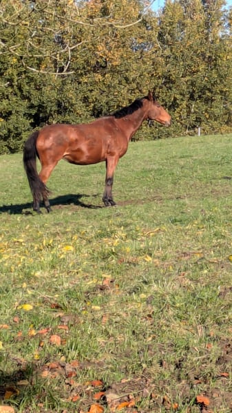 Nous recherchons une nouvelle famille pour notre jument pur-sang anglais Bailey, née en 2014, mesurant environ 1,65 m. Bailey n’est pas simplement un cheval, c’est une véritable personnalité et un coup de cœur absolu pour « sa » personne. Ce qui la distingue, c’est son caractère exceptionnel. Elle est extrêmement proche des humains, cherche toujours le contact et souhaite plaire à son partenaire. Ceux qui recherchent une relation profonde la trouveront en elle. Lorsqu’elle ne connaît pas quelqu’un, elle peut parfois se montrer réservée, mais une fois qu’elle connaît et apprécie une personne, elle se tourne vers elle. Elle est aussi très intelligente et adore être stimulée mentalement – le travail à pied et l’apprentissage de tricks lui procurent beaucoup de plaisir, et elle comprend souvent de nouvelles choses en un temps record. En extérieur, elle est une compagne fidèle et aime beaucoup sortir. Lorsqu’elle est seule, elle peut se montrer prudente, en veillant à la sécurité de son cavalier. En groupe ou en main, cela ne pose aucun problème. Bailey est un cheval exceptionnel pour quelqu’un qui cherche plus qu’un simple « équipement sportif » : un véritable ami pour la vie. Actuellement, Bailey est utilisée comme cheval de voltige. Elle est aussi très douce et attentive avec les enfants. Cependant, je ne la considérerais pas comme un « cheval pour enfants » : de temps en temps, son sang chaud refait surface, et si sa personne de référence devient incertaine ou nerveuse, elle peut aussi le devenir. L’année dernière, Bailey a subi une fracture du rayon du sabot suite à une grave inflammation du pied, ce qui l’empêche désormais d’être utilisée de manière intensive en voltige, ce qui était son rôle dans notre club. Une particularité de la fracture du rayon est que l’os est entouré de liquide articulaire, ce qui complique sa cicatrisation. Cependant, Bailey se porte bien. Elle ne boite pas, ne nécessite pas de médicaments et peut facilement rejoindre le groupe au pré. Étant donné que l’os en cours de cicatrisation incomplète présente un risque pour d’éventuelles blessures aux tendons, elle doit être exercée avec précaution. Nous avons commencé un programme de rééducation il y a quelques semaines : 2 à 3 fois par semaine, 15-20 minutes de trot en longe, du travail à pied et des promenades. Une fois par semaine, elle fait une courte séance de voltige au pas. Sous cette charge, elle reste stable. Bailey est le cheval idéal si tu souhaites plus qu’un simple partenaire sportif, à savoir une relation avec un être vivant. La reprise classique en dressage, des sorties dynamiques ou même du saut d’obstacles ne sont plus recommandées, même si elle ne présente pas de boiterie – simplement pour préserver sa santé. Nous recherchons une personne qui placera le bien-être de Bailey en priorité et qui sera prête à s’engager dans sa prise en charge, en tenant compte de sa situation médicale. Nous sommes transparents à ce sujet : les intéressés sérieux peuvent parler à nos vétérinaires et consulter tous les diagnostics. Hormis la prudence pour ne pas la surcharger, il n’y a pas d’autres précautions particulières à prendre. Elle supporte un foin de qualité 24/7 (oui, si elle ne fait rien, elle peut prendre un peu de poids, mais cela ne pose pas de problème métabolique), elle n’a pas besoin de médicaments réguliers ni de soins vétérinaires fréquents. Nous lui donnons une alimentation complémentaire de haute qualité, ce qui a grandement contribué à ses progrès. Dans le groupe, elle est facile, ni dominante ni particulièrement dominée. Nous souhaitons pour Bailey une pension en paddock avec une troupe stable. Elle sera confiée à son nouveau propriétaire lorsque tout le monde sera satisfait et qu’un bon accord sera trouvé. La remise pourra se faire avec un contrat de protection si tout se passe bien. Si tu viens de la région (max. 150 km autour de Dießen) et que Bailey a retenu ton attention, n’hésite pas à nous contacter ! Nous serions ravis que tu te présentes brièvement, que tu expliques pourquoi Bailey t’intéresse et comment tu envisages votre avenir ensemble. Les « prix de réserve » ou demandes similaires ne seront pas répondues. Il est évident que nous ne cherchons pas à faire de gros bénéfices : le bien-être de Bailey et un bon placement sont notre priorité absolue. Nous ne souhaitons pas de négociations sur le prix avant de faire connaissance. Si pour toi, 200 € ou quelques euros de plus ou moins sont déterminants, ce n’est pas le bon cheval pour toi – compte tenu des coûts réels liés à un cheval, cela ne devrait pas avoir d’importance.