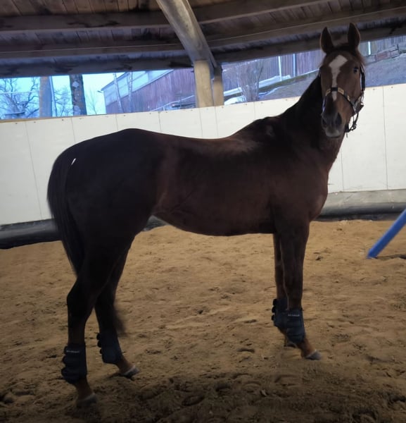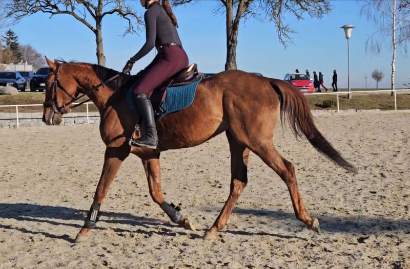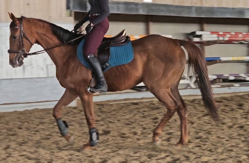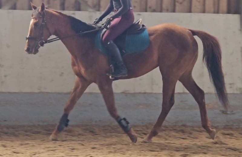 Charming Thoroughbred Mare – Raw Diamond in Training Details: Breed: Thoroughbred Gender: Mare Color: Chestnut Date of Birth: March 14, 2021 (5 years old) Height: approximately 16.0 hh Description: This lovely chestnut mare is for sale, impressing with her honest character and eagerness to learn. A former racehorse, she is currently in retraining as a riding horse and demonstrates cooperation and courage when paired with the right rider. Character & Handling: In daily handling, she is well-behaved, people-oriented, and uncomplicated. She is farrier- and loading-friendly and handles well in new situations. Training Level: She has a very sensitive mouth and responds delicately to aids. As she is still at the beginning of her new career, she needs further physical (muscular) development. However, she has the perfect attitude: extremely eager to learn and motivated. Special Features: - Very easy to ride (not a "biter"). - Fearless temperament. - Ideal for riders who wish to continue her training themselves. Requirements for the buyer: Due to her age and current training level, she is not suitable for beginners. We are looking for a home with experienced young horse handlers who can continue her development with patience and time. Price: €5,500 negotiable