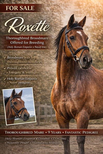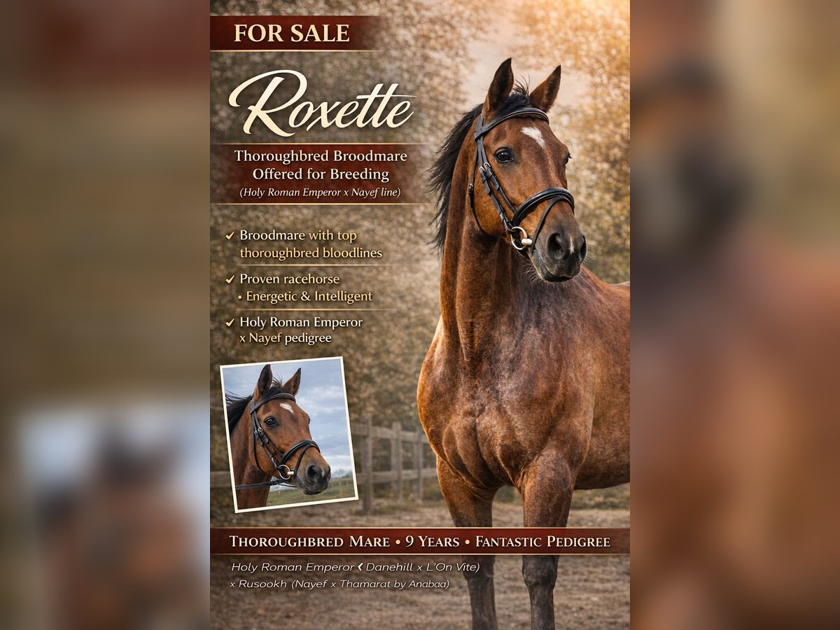 Interior (character) A somewhat reserved mare with clear boundaries. Not a social butterfly in the stable: she needs to get to know you first and can respond distantly or sharply to strangers. Well-handled with familiar people. In work, she is very willing and cooperative; she easily picks up lunging and training. She requires plenty of movement, consistency, and an experienced handler who is firm but fair. Exterior (conformation, markings) Thoroughbred (xx) with an athletic, sporty build and a refined appearance. Correct, dry legs and a light-footed way of moving. Color/markings: Bay, markings / whorls (crowns): double crown high on the crest of the neck on both sides (double whorl upper third crest both sides). A feathered crown halfway along the trachea (feathered whorl mid trachea). Additionally, there are crowns in both armpits (bilateral axillae whorl). Head: double crown centrally above eye level (double whorl about median above eye level). On the right side, a crown within a small star (right whorl contained within a small star). Color/other visible markings: small white blaze just above the eyes. Other characteristics Very easy to load onto the trailer; loading and transport pose no problems. Well-trained in lunging and groundwork. Fit and energetic, benefiting from daily movement and a consistent routine. Special features of the horse Former racehorse. Suffered a knee injury at age 2 during racing season; treated and subsequently successful in racing again, placing as a 4-year-old. Not saddle-trained but has done groundwork — needs to be re-started under saddle. Offered as a broodmare with a strong international pedigree. Pedigree: Holy Roman Emperor (Danehill x L’On Vite) x Rusookh (Nayef x Thamarat by Anabaa).