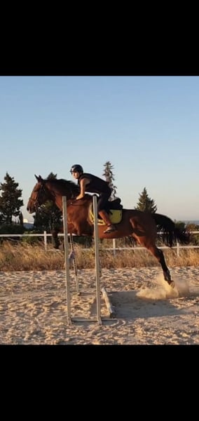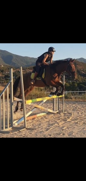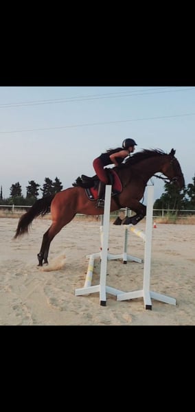 Purebred English mare for sale. She has jumped up to 130 cm in free jumping and has a 1-meter course record. She has not jumped for several months and is currently being trained in classical dressage at a basic level. She has a very good temperament, is calm, easy to handle, and very attentive to her rider. She has won several show jumping competitions (up to 1 meter).