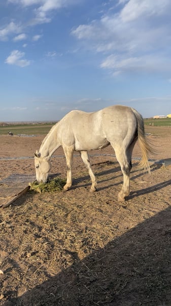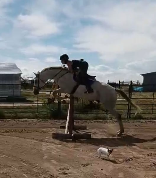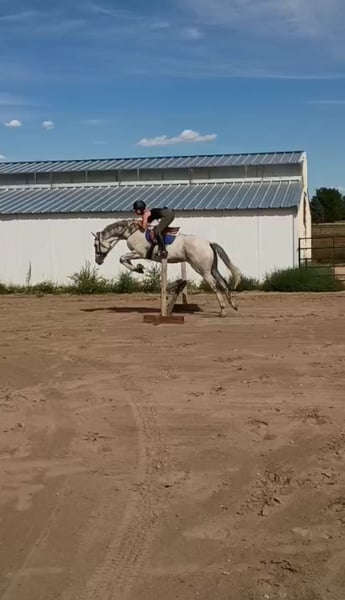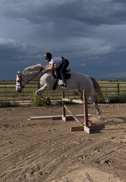 “Goose” Located in Kersey, Colorado Bumpty Bump Bump, “Goose” is out of “Road Ruler” and “Antagoniz’em”. He has been off the track since 2022 and he has had a lot of experiences and fun since then. What he knows: * Jumping, 2’-2’3 comfortably, can jump 3’ with more consistent work * English riding, still learning lead changes but he does have them most of the time * Western riding, he’s comfortable with a western saddle and roping (haven’t roped out of the box yet) * Trail riding, he’s a pretty desensitized boy What is his temperament: * Very loving toward anyone, horses too * Very willing to learn * Doesn’t buck, but if he is getting frustrated learning something new, he will do a small rear (I’m working on cracking that habit and it’s getting better) * He stands very well with the farrier * He loads great, with others and by himself * He absolutely loves water, baths, rivers, puddles, anything * He ground ties, I’ll be working another horse in the arena and I’ll leave him in the middle with his lead over his neck and he won’t move a muscle * If you have him at a trailer and your tacking up, you can leave him untied What do I think he could be: * I think he can definitely show off in the hunter/jumper ring, he is quite athletic * he could also be a sweet intermediate kids horse, I’ve had a 6 year old ride him countless times * He could take someone very far if they’re consistent Why do I need to sell him: * My main riding discipline is western, I love both tho! * I simply do not have the time to be consistent with him and make him what I know he can be * If I could keep him I definitely would! Feel free to email me sromosonneman@gmail.com or call 720-745-2069 with any questions ! Height: 16’2 Weight: 1100 Registered: Yes Registration Association: The jockey club Registration Number: 1423087 Age: 11 Date Foaled: 02/10/2014 Color: Gray Discipline: Jumping Gender: Gelding Is this a rescue?: No