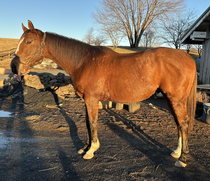 Nicky is a 12 year old 16hh Thoroughbred gelding. He is pleasant to have in the barn, easy keeper, currently out with 2 mares and is barefoot with great feet. He has been in a program for the last month and has started jumping. Quiet with three nice gaits. He can take a joke over fences and is very forgiving. Learning how to take contact but is very happy to go around on a loose rein. I have put some lessons kids on him and in a program I think he would be an excellent addition to any lesson barn. He will hack around the farm and once the weather gets nicer he will start going out on trail to asses if he enjoys that! He is very sweet on the ground, loves attention. He will stay in a training program until he sells!